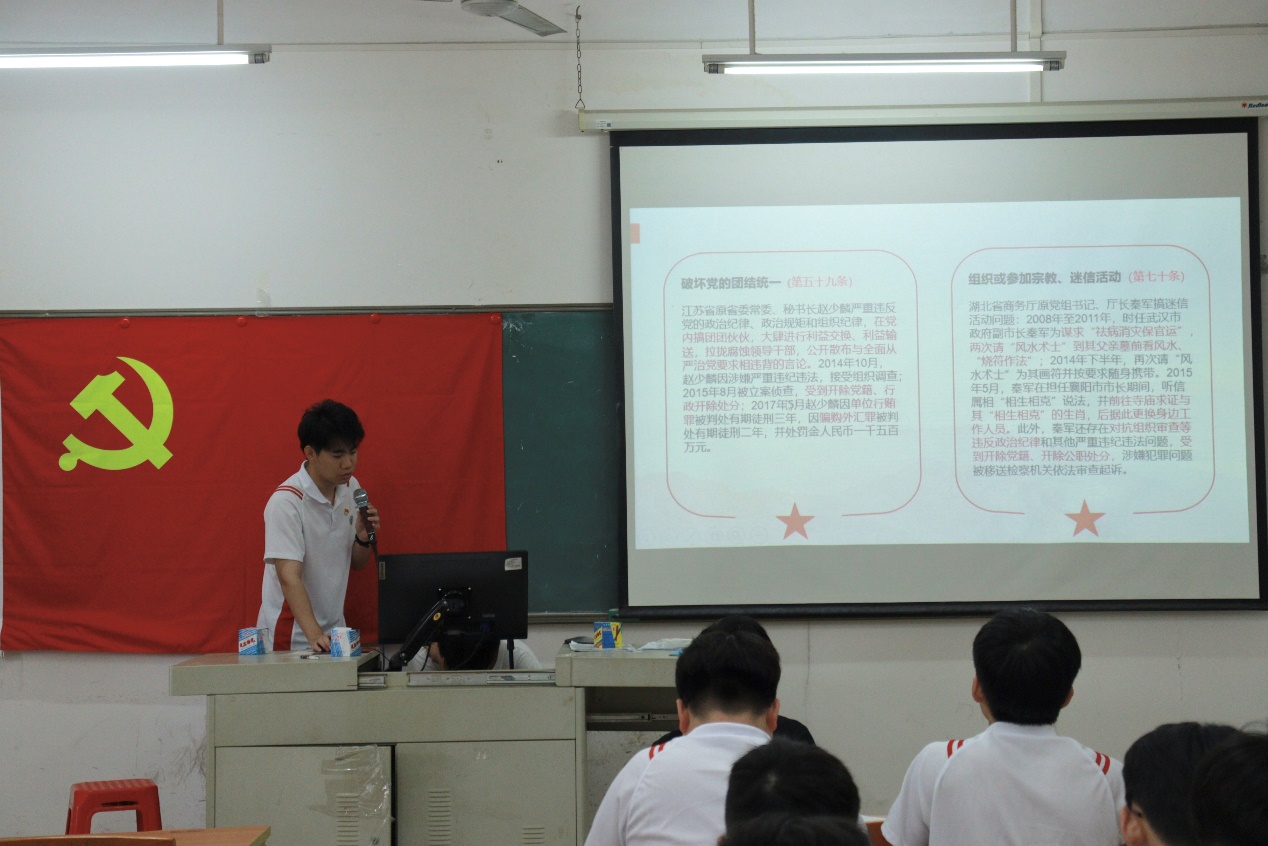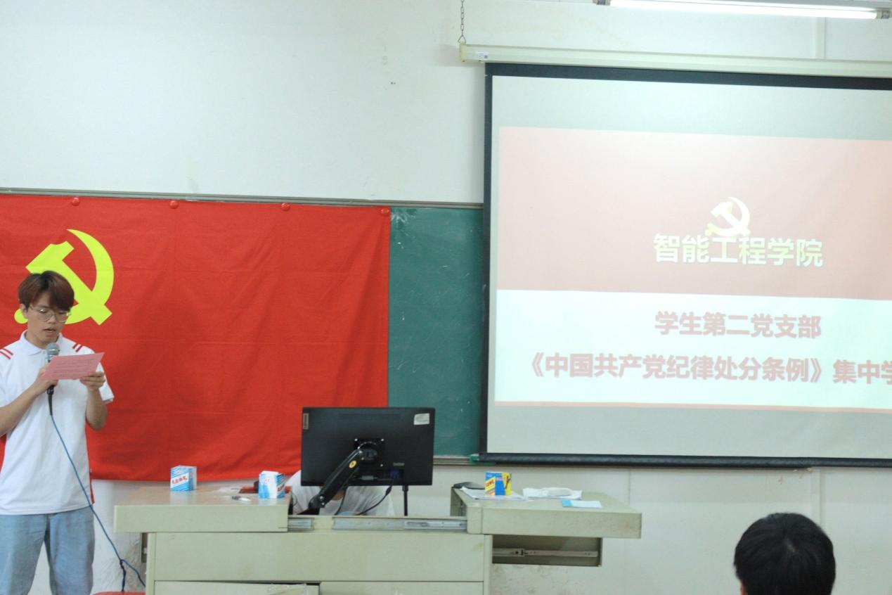 为进一步深化党纪学习教育,确保全体党员能够全面学纪、深刻知纪、清晰明纪、坚决守纪,智能工程学院学生第二党支部于6月13日中午,在博学楼c栋507课室,围绕新修订的《中国共产党纪律处分条例》组织开展了深入学习活动。此次学习由支部组织委员郭梓锋同志主讲,全体党员同志均积极参与,共同研讨学习。