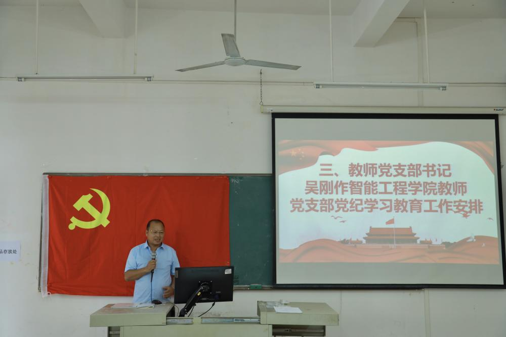 随后,教师党支部书记吴刚对智能工程学院教师党支部党纪学习教育工作进行了安排。他提出了一系列具体的学习计划和活动,包括学习党纪资料、定期举办党纪主题教育活动等,旨在提高党员教师的党性修养和业务能力。