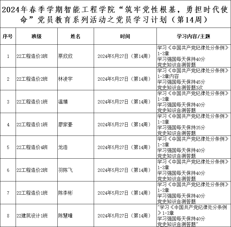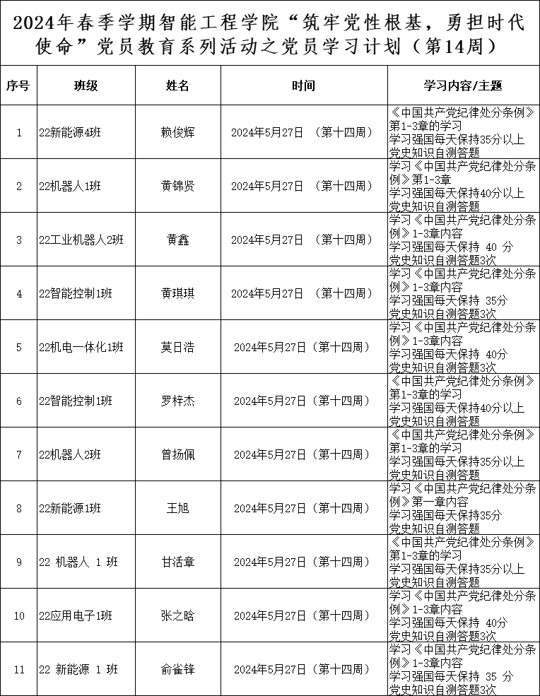 为深化党员的自我教育管理模式,切实提升党员自我教育管理实效,智能工程学院党总支针对现阶段党员教育管理不足现状,积极探索,组织开展党员自我教育学习活动,锚定学习目标,认真贯彻落实,狠抓推进整改,抓好奖励惩罚。现将第十四周党员学习计划及检查结果公布如下。