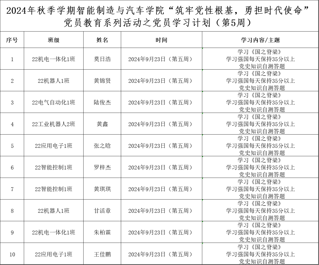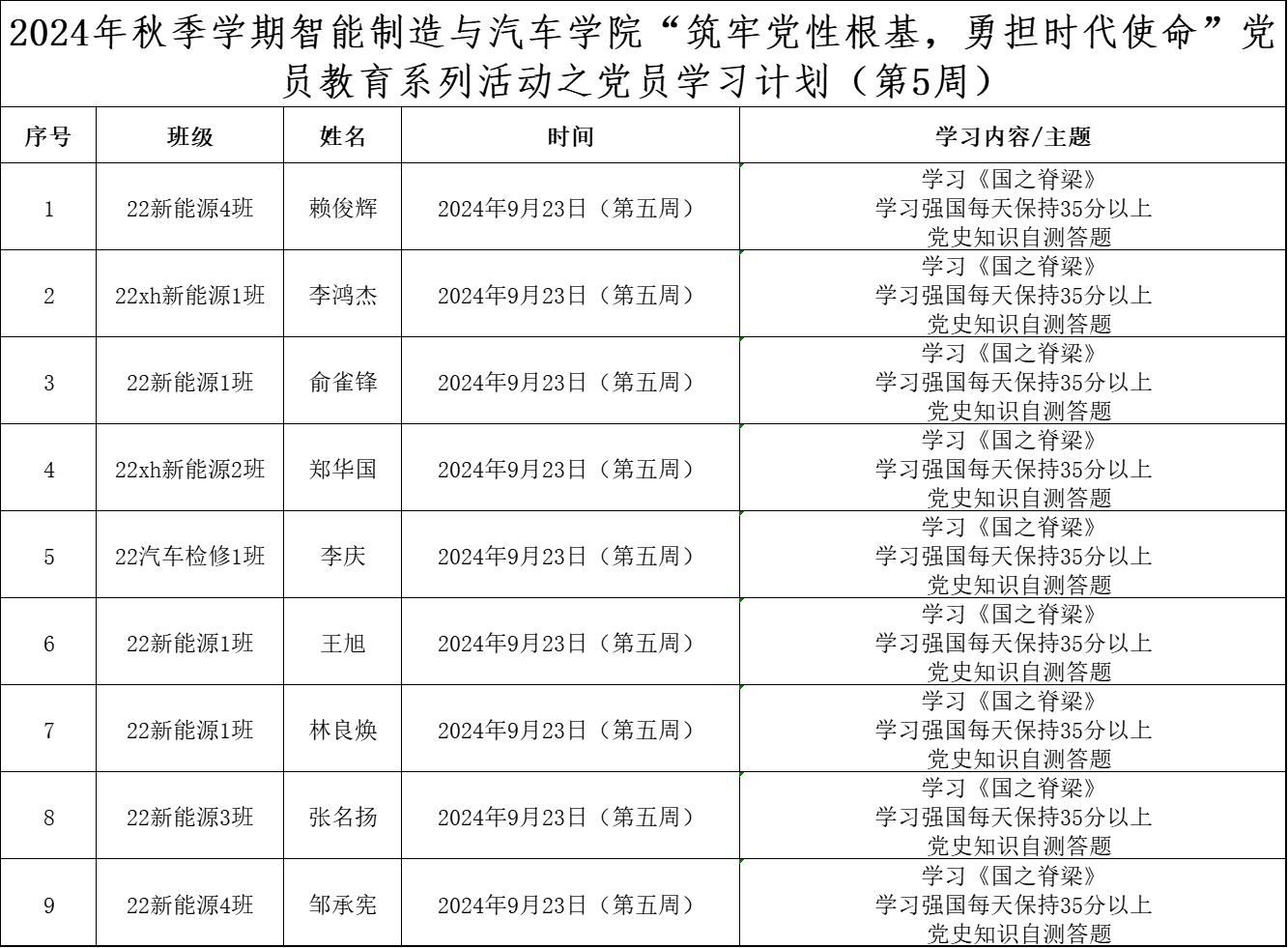 为深化党员的自我教育管理模式,切实提升党员自我教育管理实效,智能制造与汽车学院党总支针对现阶段党员教育管理不足现状,积极探索,组织开展党员自我教育学习活动,锚定学习目标,认真贯彻落实,狠抓推进整改,抓好奖励惩罚。现将第五周党员学习计划及检查结果公布如下。