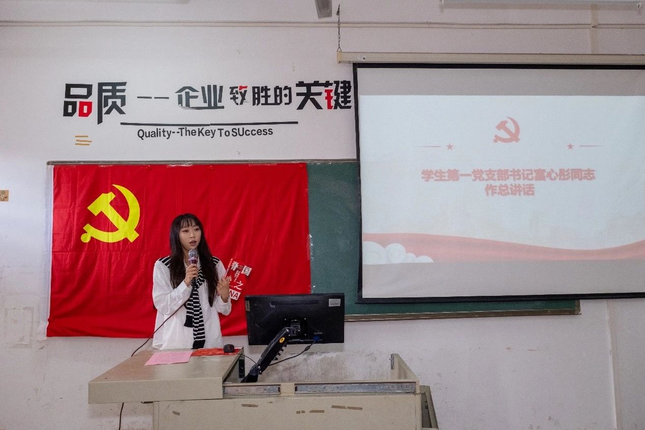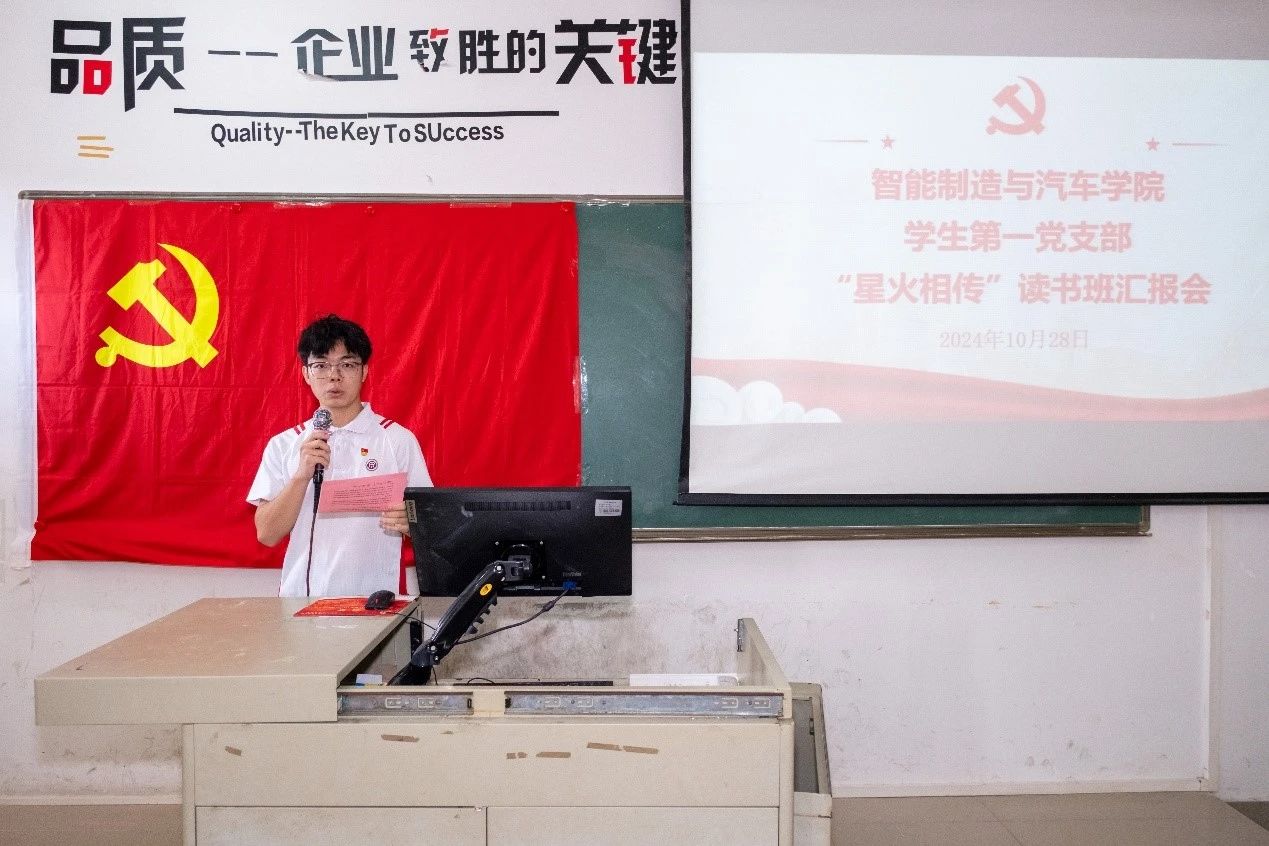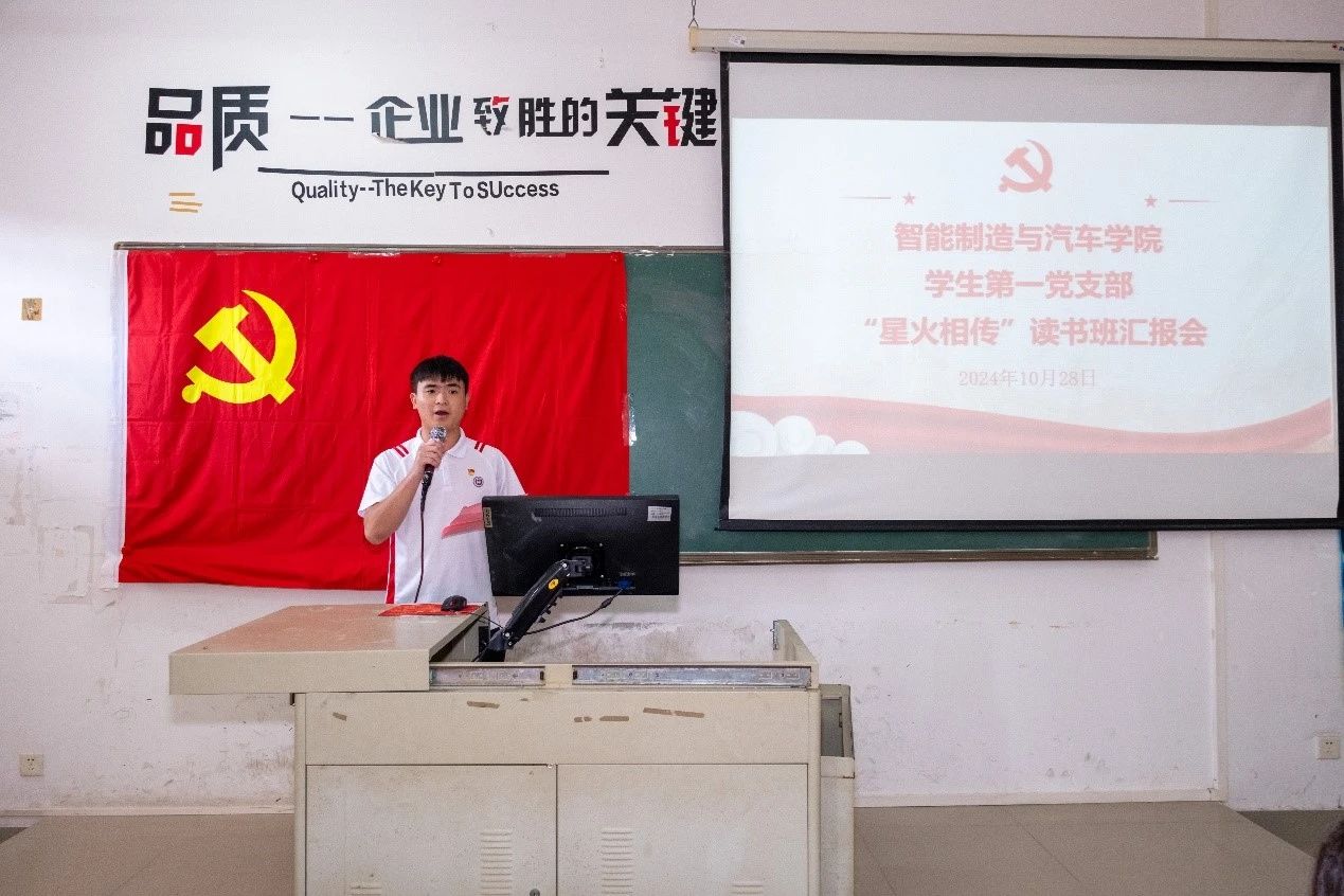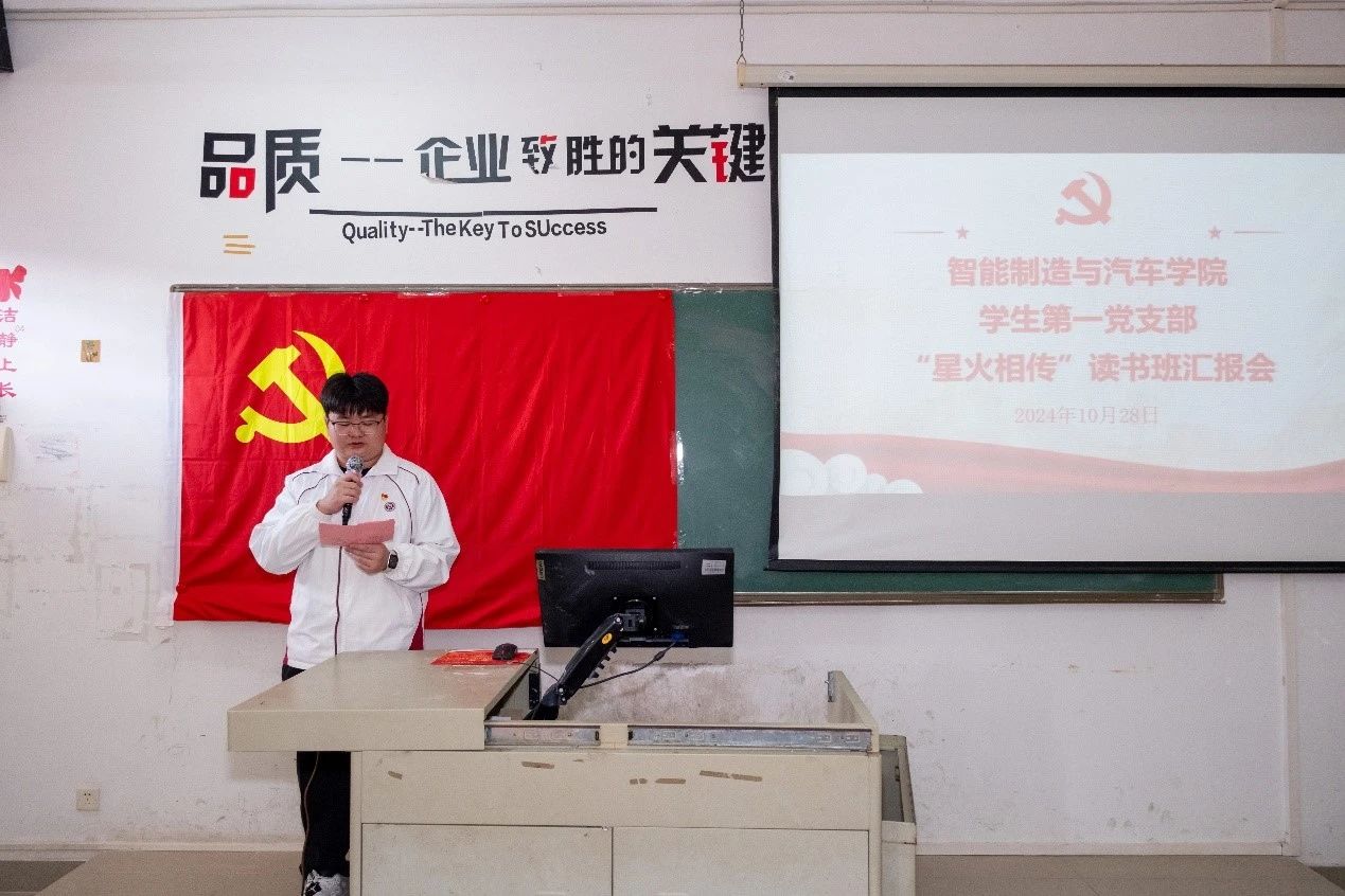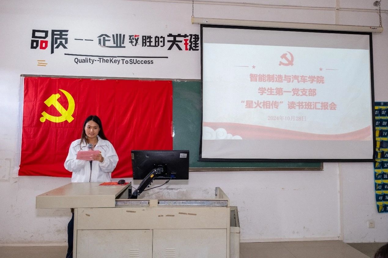 最后智能制造与汽车学院学生第一党支部书记富心彤同志作总结发言。她希望同学们能持续学习,不断进步,将所学所得转化为实际行动,不断践行党的宗旨,为实现中华民族伟大复兴的中国梦而不懈奋斗。让我们共同努力,让“星火”之光永远璀璨,照亮我们前行的道路!