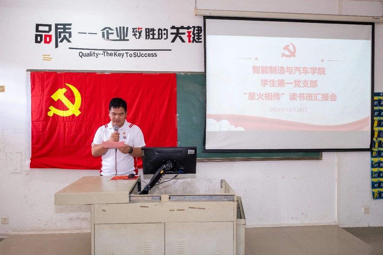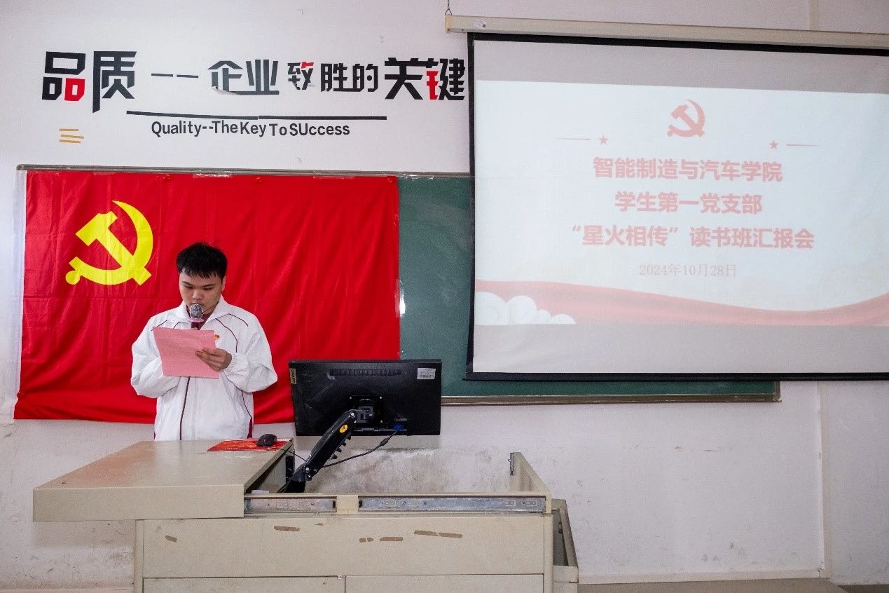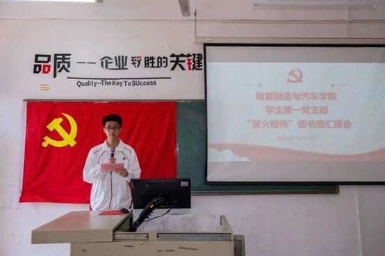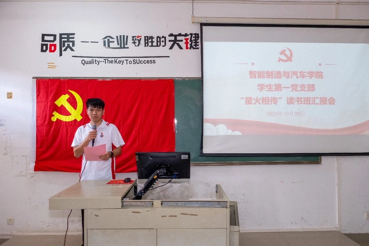 为深入贯彻习近平新时代中国特色社会主义思想,充分激发党员的学习热情,引导党员培养爱读书、善读书、读好书的良好习惯。10月28日,智能制造与汽车学院(广州校区)学生第一党支部在博学楼B505开展第四期“星火相传”读书班汇报会。本次读书班主要围绕各党员分享阅读《国之脊梁》的心得体会所展开。