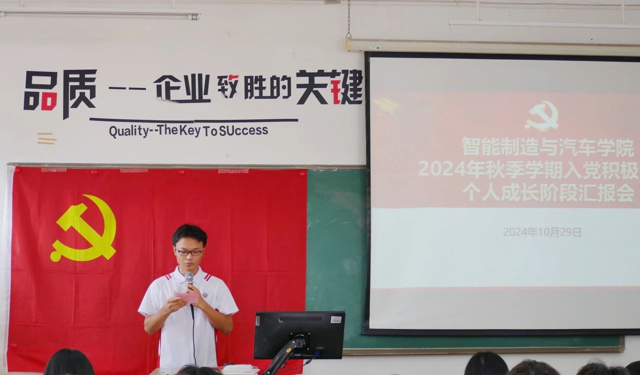 为充分了解入党积极分子在考察期间的表现情况,进一步加强党员队伍建设,充实党的新生力量,永葆党的青春活力,增强党员的使命担当。智能制造与汽车学院(广州校区)于10月29日中午以支部为单位,组织召开2024年秋季学期入党积极分子个人成长阶段第二期汇报会。学院党总支副书记姚柏洲,第一、第二党支部委员及23级入党积极分子参会。