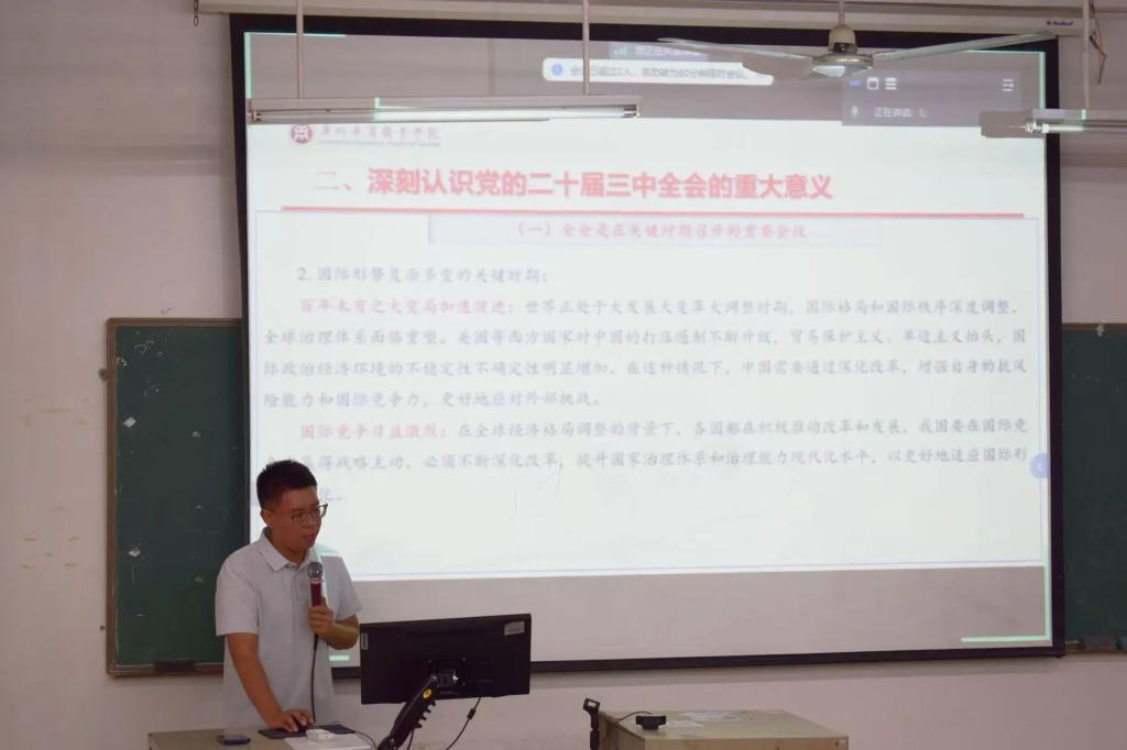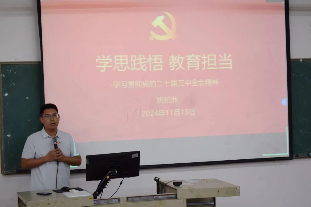 学院党总支副书记姚柏洲同志就学习贯彻党的二十届三中全会精神为主题为同学们开展了党课学习教育。姚书记从介绍党的二十大及其历次全会、认识党的二十届三中全会的重大意义和当代青年应该如何贯彻党的二十届三中全会精神三个方面进行授课,深入浅出地剖析了党的二十届三中全会精神。并要求同学们要坚定不移走中国特色社会主义道路,勇于开拓创新,为中国式现代化建设提供不竭动力。要不断通过学习、理解、领悟和践行全会精神,不断强化自身的思想武装,确保在思想上、政治上、行动上与党中央保持高度一致。