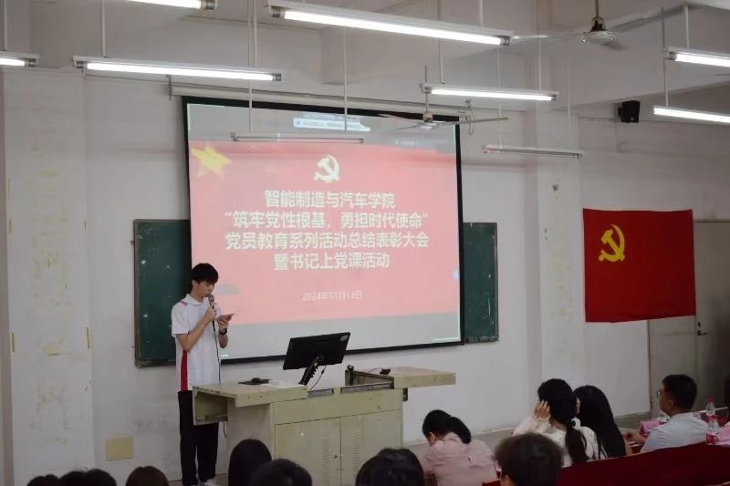 为了深入学习贯彻党的二十届三中全会精神,深刻理解把握习近平总书记重要讲话的丰富内涵,加强党员队伍建设,强化党员发展质量,激励同学们在新时代展现新担当、实现新作为,智能制造与汽车学院于2024年11月13日在博学楼C501教室举行了“筑牢党性根基,勇担时代使命”党员教育系列活动总结表彰大会。学院党总支副书记姚柏洲同志,教师、第一、第二和第三党支部委员、党员老师代表、学生党员、发展对象和入党积极分子参会。