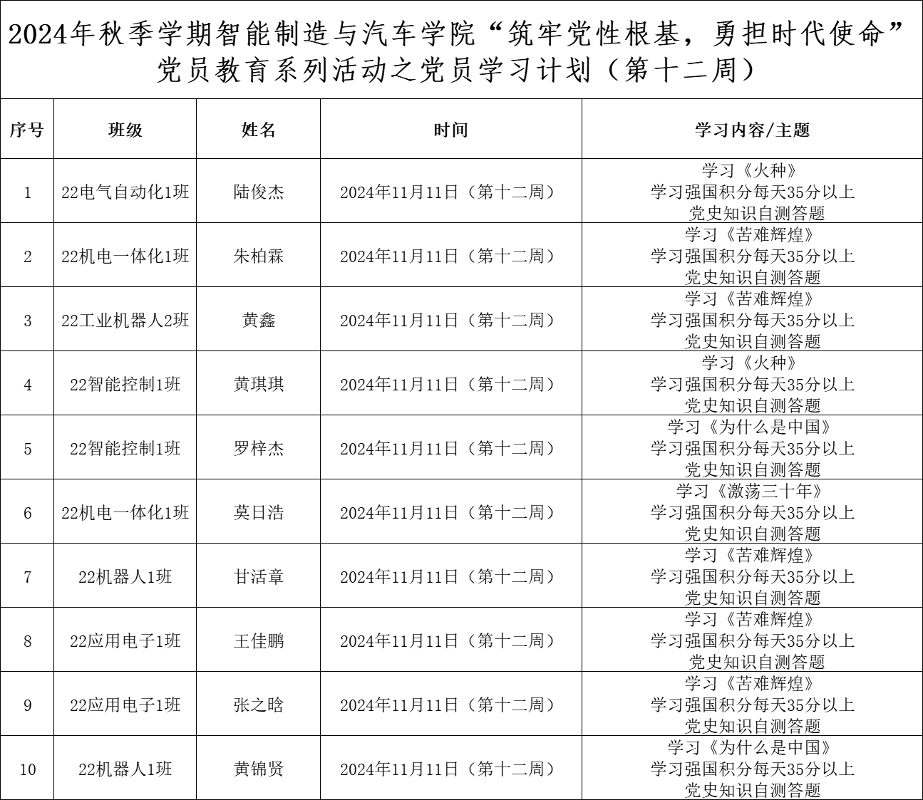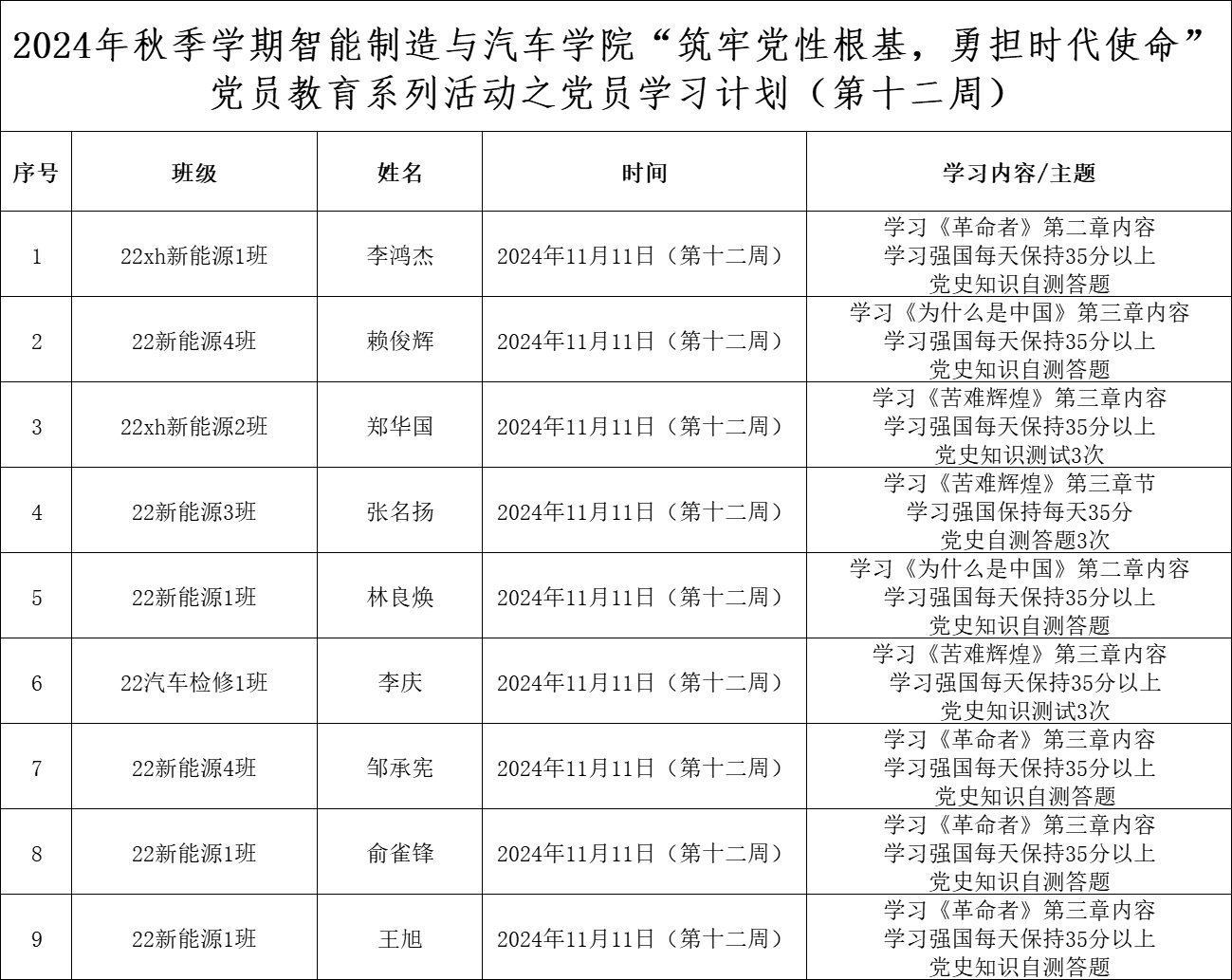 为深化党员的自我教育管理模式,切实提升党员自我教育管理实效,智能制造与汽车学院党总支针对现阶段党员教育管理不足现状,积极探索,组织开展党员自我教育学习活动,锚定学习目标,认真贯彻落实,狠抓推进整改,抓好奖励惩罚。现将十二周党员学习计划及检查结果公布如下。