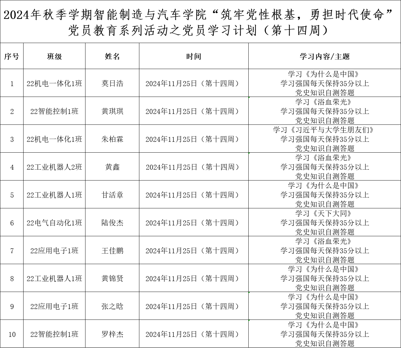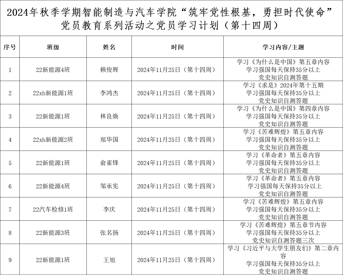 为深化党员的自我教育管理模式,切实提升党员自我教育管理实效,智能制造与汽车学院党总支针对现阶段党员教育管理不足现状,积极探索,组织开展党员自我教育学习活动,锚定学习目标,认真贯彻落实,狠抓推进整改,抓好奖励惩罚。现将第十四周党员学习计划及检查结果公布如下: