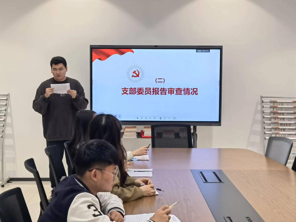 支部组织委员吴泽森老师代表支部委员会报告了对凌华杰同志等4位发展对象的政治审查情况,4名同志思想品质良好、入党动机端正、入党材料齐全、政治历史清楚,同意提交支部大会讨论表决。