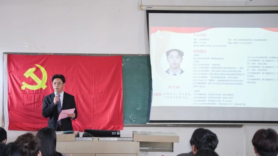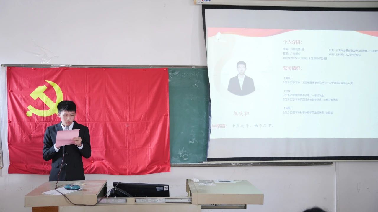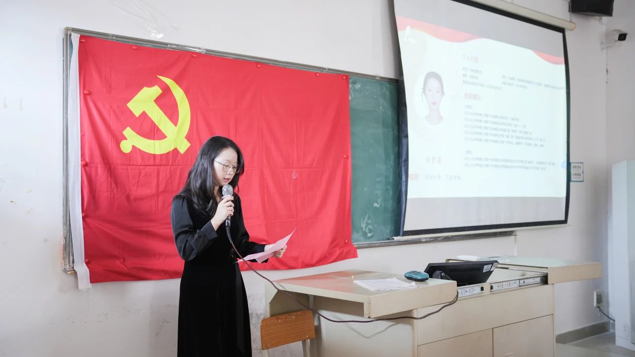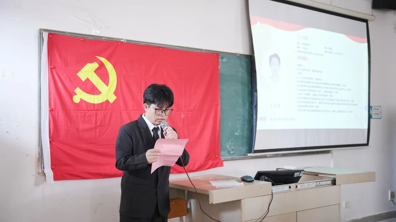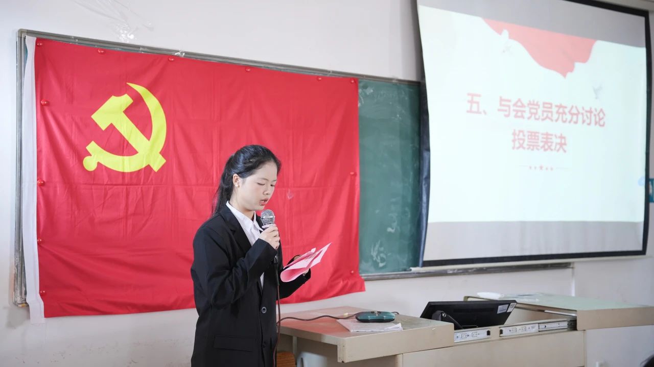 大会第三项议程,入党介绍人对发展对象的有关情况进行阐述,表明自己的意见及建议。党员老师们介绍陈灶鹏等5名同志的表现情况,他们入党态度端正,表现出色,积极主动研读党史著作,深刻把握党的方针内涵,认为陈灶鹏等5名同志已基本具备了共产党员条件,并愿意介绍其吸收为预备党员。