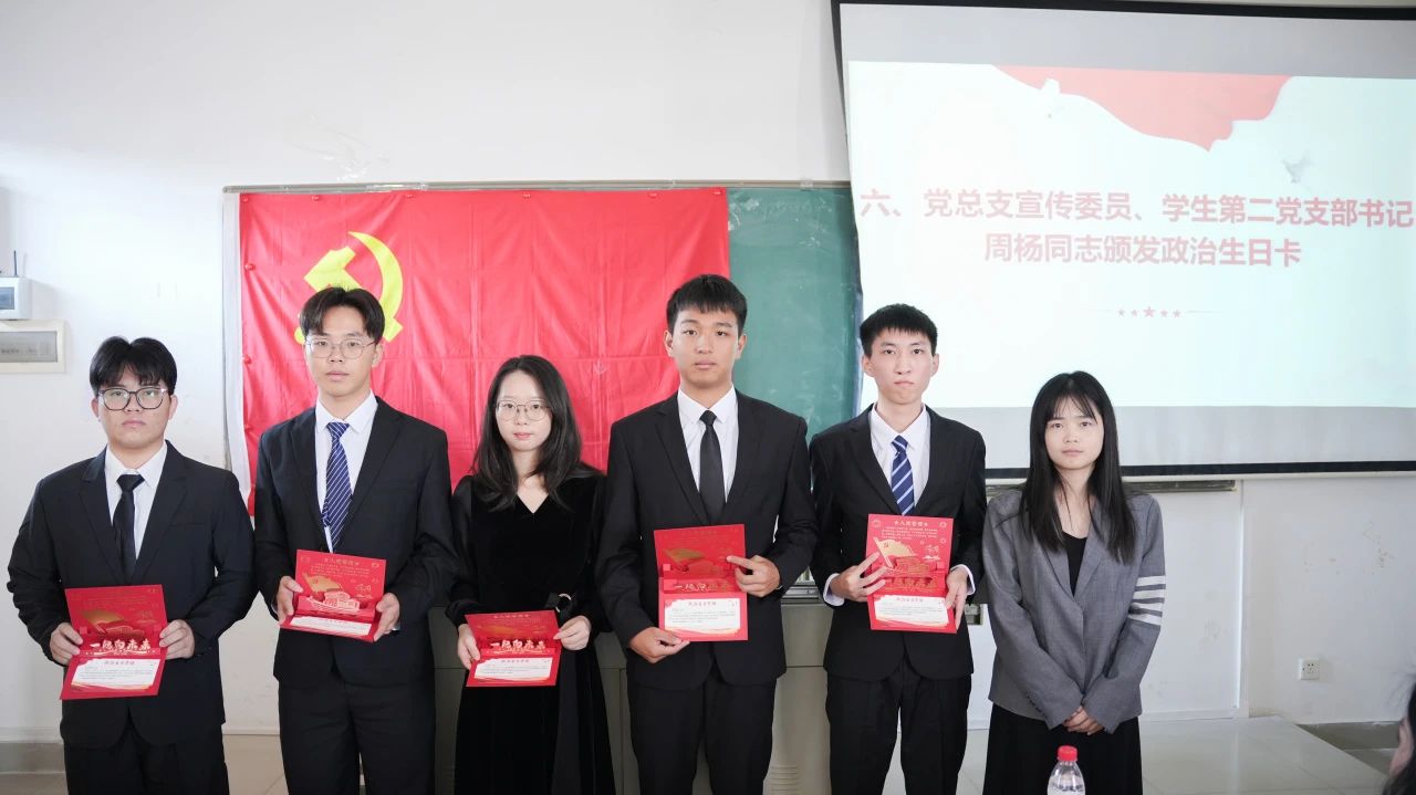 大会第六项议程,学生第二党支部书记周杨同志为陈灶鹏等5名同志颁发政治生日卡。周杨同志将一张张政治生日卡递交到他们手中,他们目光诚挚,无比自豪。此刻,这张小卡片变得格外沉重,串联起未来新征程,让他们那初心滚烫、使命在肩的信念愈发坚定。