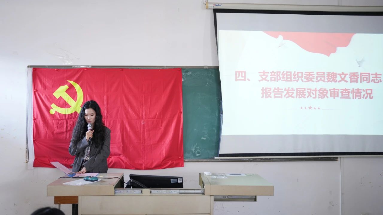 大会第四项议程,学生第二党支部组织委员魏文香同志报告对发展对象的审查情况。她宣读支部委员会对陈灶鹏等5名发展对象的审查结果,认为陈灶鹏等5名发展对象对党认识正确、入党动机的端正,能够正确的对待组织的考验,培养考察合格,符合党员条件。