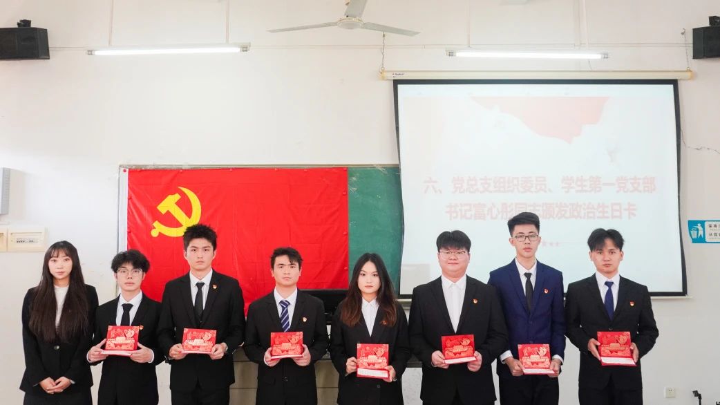大会第六项议程,学生第一党支部书记富心彤同志为甘活章等7名同志颁发政治生日卡。小小的卡片有深沉的意义,烫金的“政治生日”四字熠熠生辉,承载着组织沉甸甸的期许。