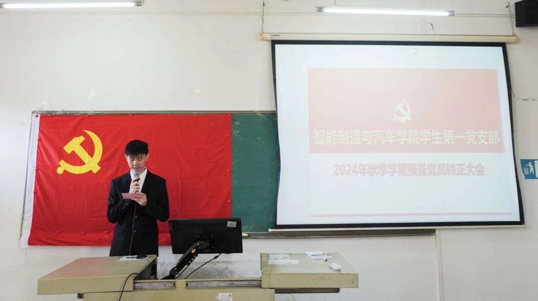 为深入贯彻党的组织建设要求,推动党员队伍高质量发展,提升党组织的引领力、凝聚力与战斗力,2024年12月7日,智能制造与汽车学院学生第一党支部在博学楼C506隆重召开2024年秋季学期预备党员转正大会。智能制造与汽车学院党总支副书记姚柏洲同志、学院党总支组织委员、学生第一党支部书记富心彤同志、学院学生第一党支部组织委员黄琳璇同志、党员老师代表、预备党员以及发展对象参加此次会议。
