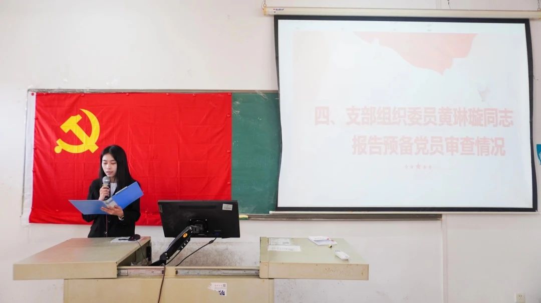大会第四项议程,学生第一党支部组织委员黄琳璇同志报告对预备党员的审查情况。她宣读支部委员会对甘活章等7名预备党员审查结果,认为甘活章等7名预备党员对党认识正确、入党动机的端正、拥护党在新时期的路线、方针、政策,能够正确的对待组织的考验,达到了培养考察合格的标准,基本符合党员条件。