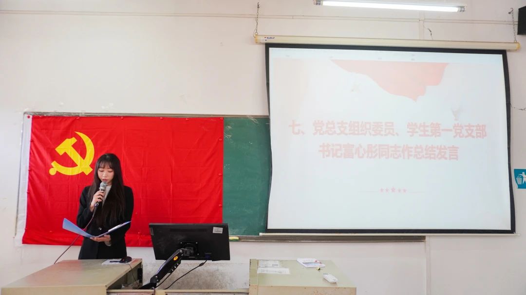 大会第七项议程,学院党总支组织委员、学生第一党支部书记富心彤同志作总结发言。富心彤同志向光荣成为中共正式党员的甘活章等7名同志表示衷心的祝贺,同时提出三点要求:一、要坚定共产主义远大理想和中国特色社会主义共同理念,要提高自己的政治觉悟,不忘党员身份发挥先锋模范带头作用。二、践行党的宗旨,坚持以人民为中心的发展思想,解决群众实际问题。三、要严守党的纪律,严守党纪国法,始终保持共产党员的先进性和纯洁性。