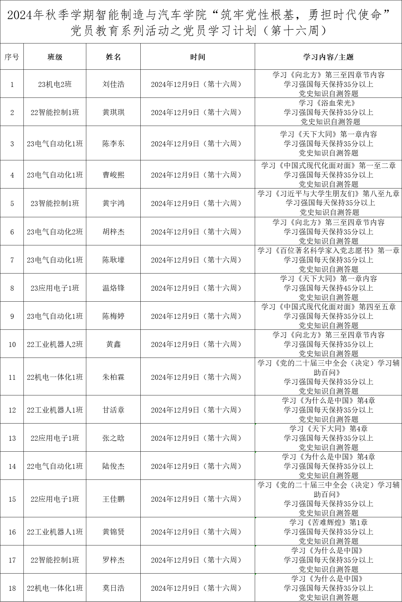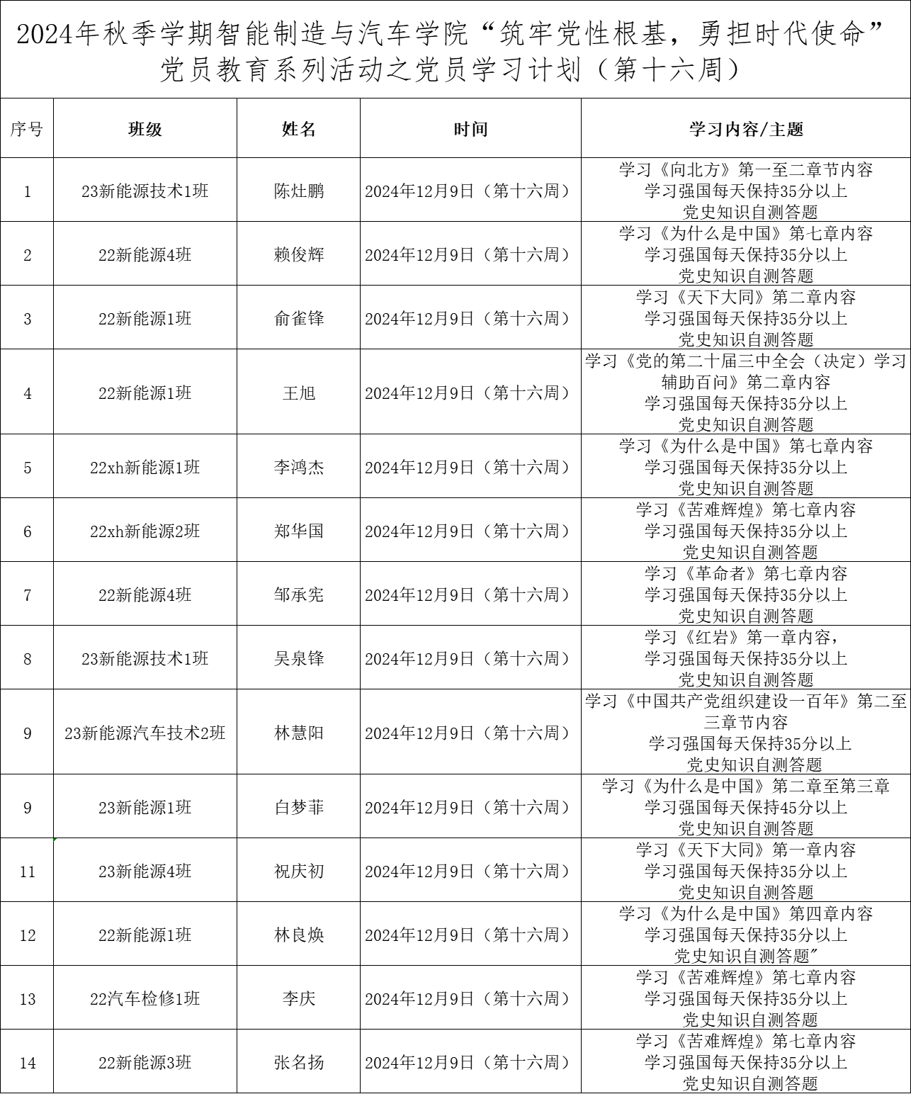 为深化党员的自我教育管理模式,切实提升党员自我教育管理实效,智能制造与汽车学院党总支针对现阶段党员教育管理不足现状,积极探索,组织开展党员自我教育学习活动,锚定学习目标,认真贯彻落实,狠抓推进整改,抓好奖励惩罚。现将第十六周党员学习计划及检查结果公布如下: