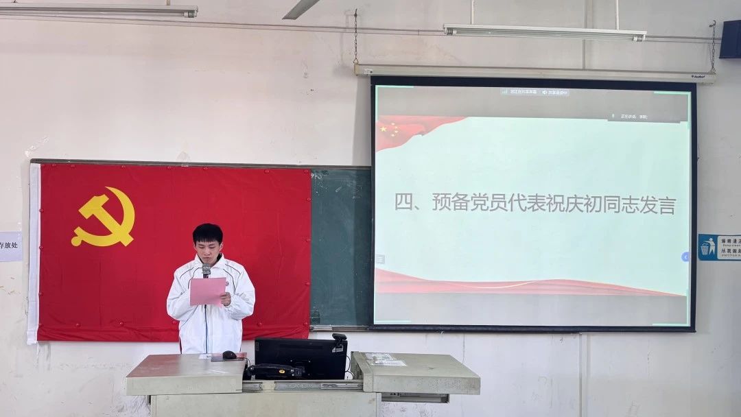 会议第四项议程,预备党员代表祝庆初同志满怀赤诚,身姿笔挺地走向讲台发言。他目光坚定而明亮,心怀热忱地讲述着自身在追求信仰之路上的成长点滴、心灵感悟,以及对未来在党旗下砥砺奋进、担当作为的坚定信念。