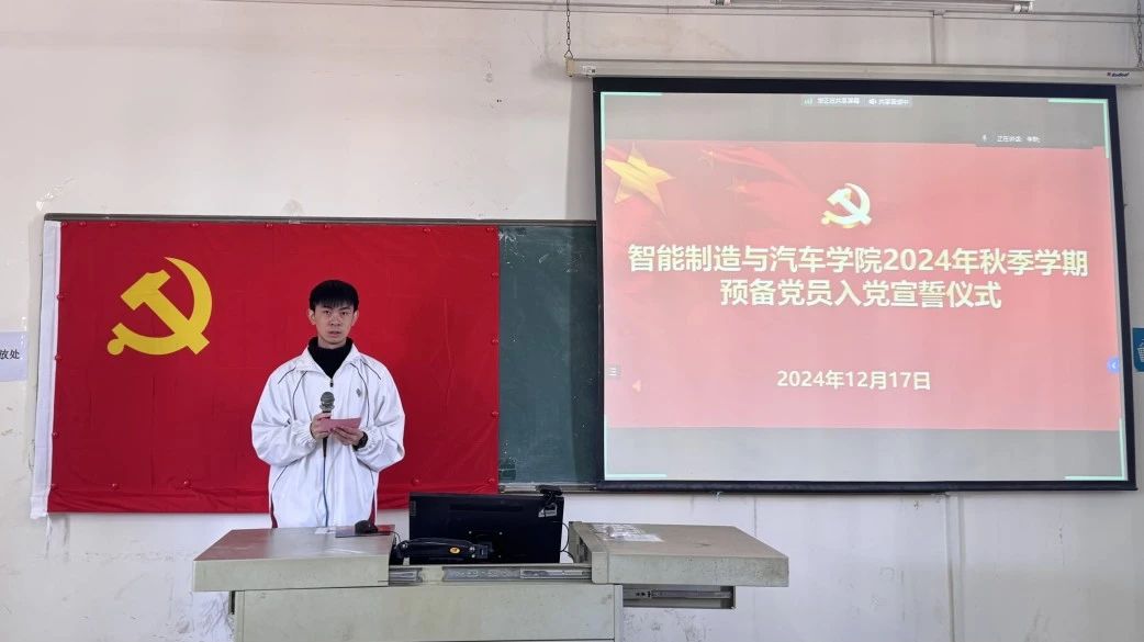 为了铭记入党初心,赓续红色血脉,2024年12月17日,智能制造与汽车学院在博学楼C507教室庄重地开展了2024年秋季学期预备党员入党宣誓仪式。智能制造与汽车学院党总支组织委员、学生第一党支部书记富心彤同志,学院党总支宣传委员、学生第二党支部书记周杨同志以及全体预备党员参与此次会议。