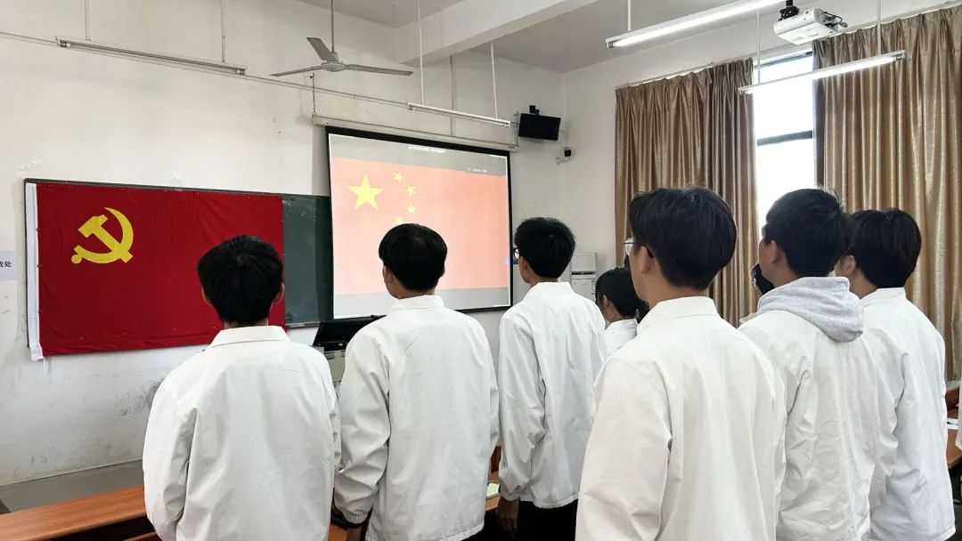 会议第一项议程,奏唱国歌。全体人员眼神坚定,满含敬意地聚焦于国旗所在之处。国歌激昂,旋律飘荡,雄浑有力的《义勇军进行曲》歌声响彻全场,为这场意义非凡的入党宣誓仪式正式拉开了序幕。