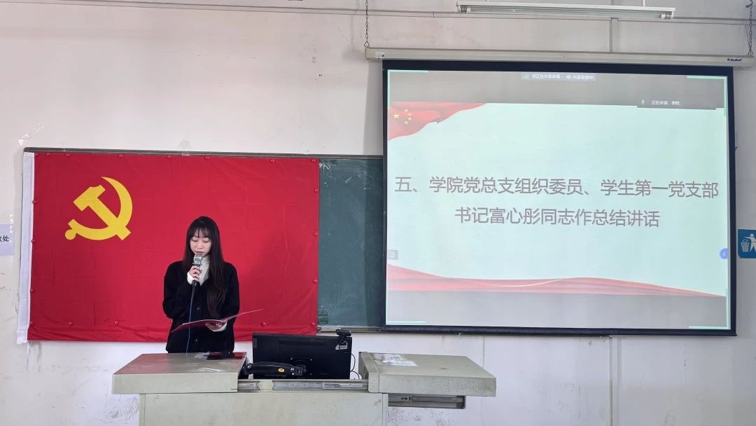 会议第五项议程,学院党总支组织委员、学生第一党支部书记富心彤同志进行总结讲话。她深入阐述了本次预备党员入党宣誓仪式的重大意义,不仅是新党员政治生命的崭新起点,更是党组织蓬勃发展的有力见证。对于如何成为一名合格的共产党员,发挥党员先锋模范作用作出指示。她希望各位预备党员铭记今日誓言,践行党员使命,严守党的纪律,做到清正廉洁,强化党性修养,密切联系群众,践行党的群众路线在时代的浪潮中勇毅前行,书写无愧于党和人民的壮丽篇章!