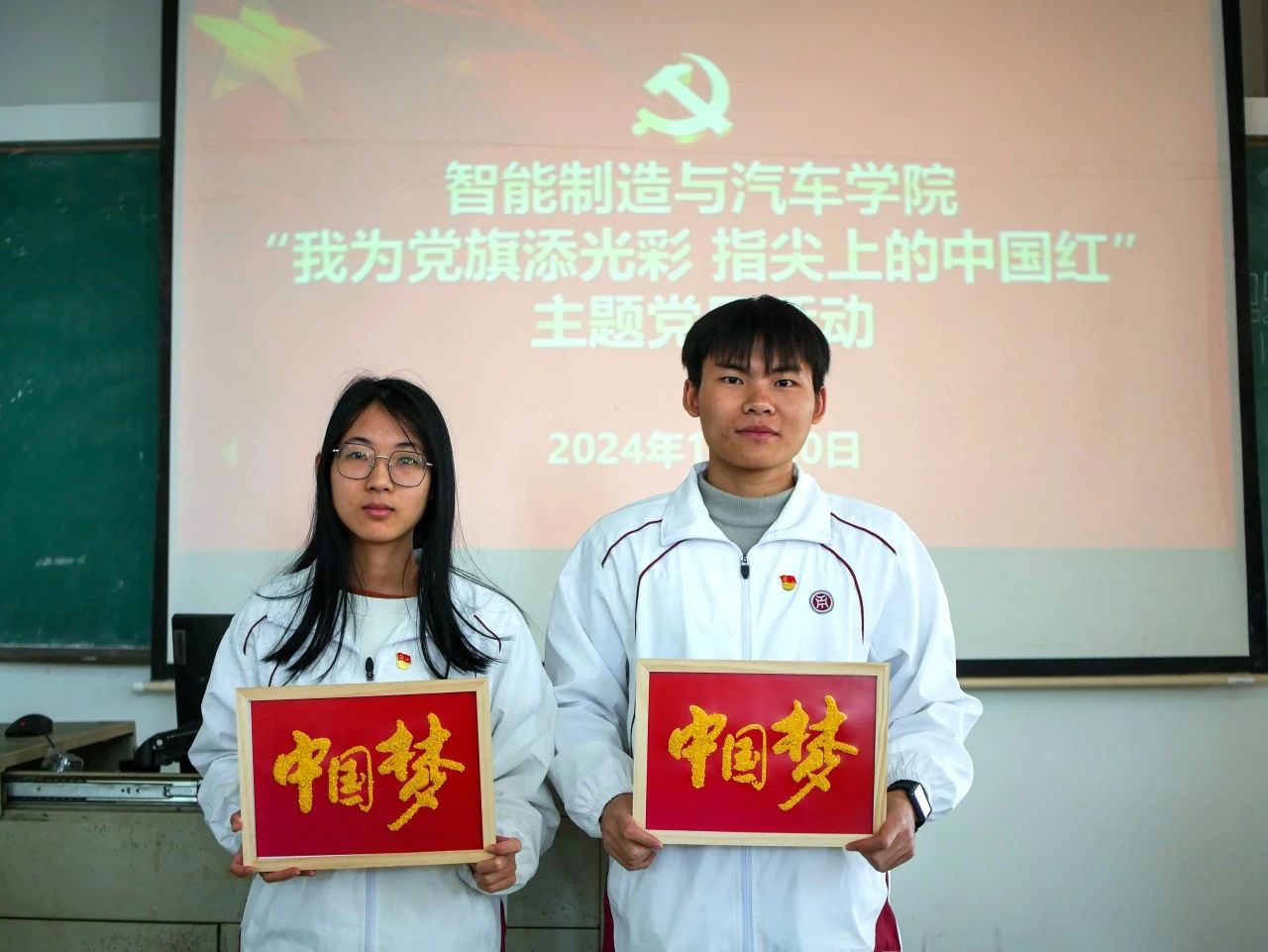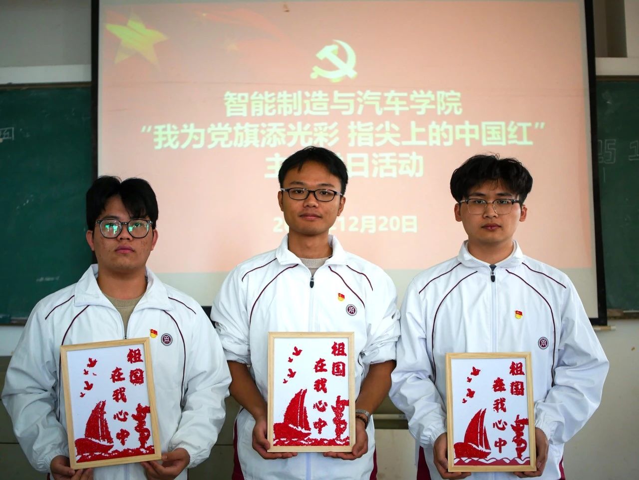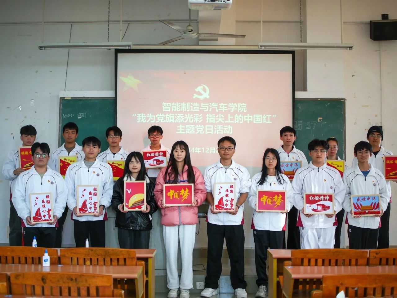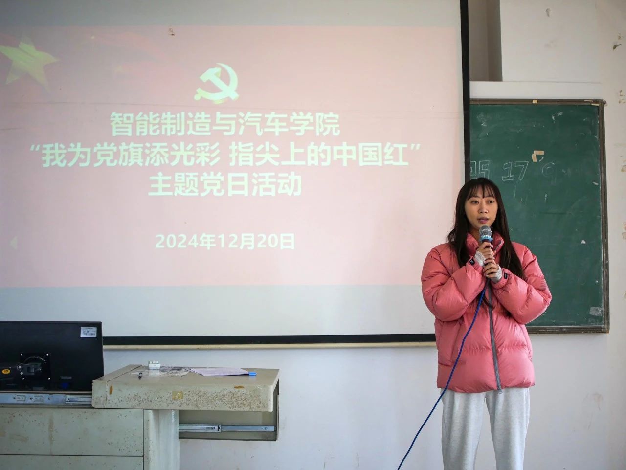 为弘扬优秀传统文化,坚定文化自信,增强党员凝聚力,2024年12月20日,智能制造与汽车学院党总支在博学楼A507举办“我为党旗添光彩,指尖上的中国红”主题党日活动。智能制造与汽车学院党总支组织委员、学生第一党支部书记富心彤同志、学院党总支宣传委员、学生第二党支部书记周杨同志以及全体预备党员参加此次活动。
