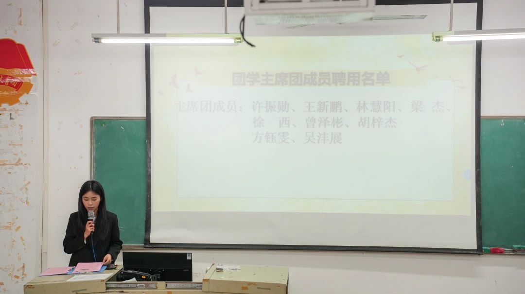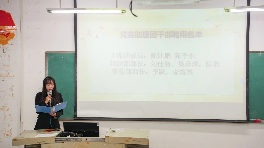 学生第一党支部书记富心彤老师、院团委书记黄琳璇老师分别宣读了新一届党务干部名单、新一届团学干部名单。