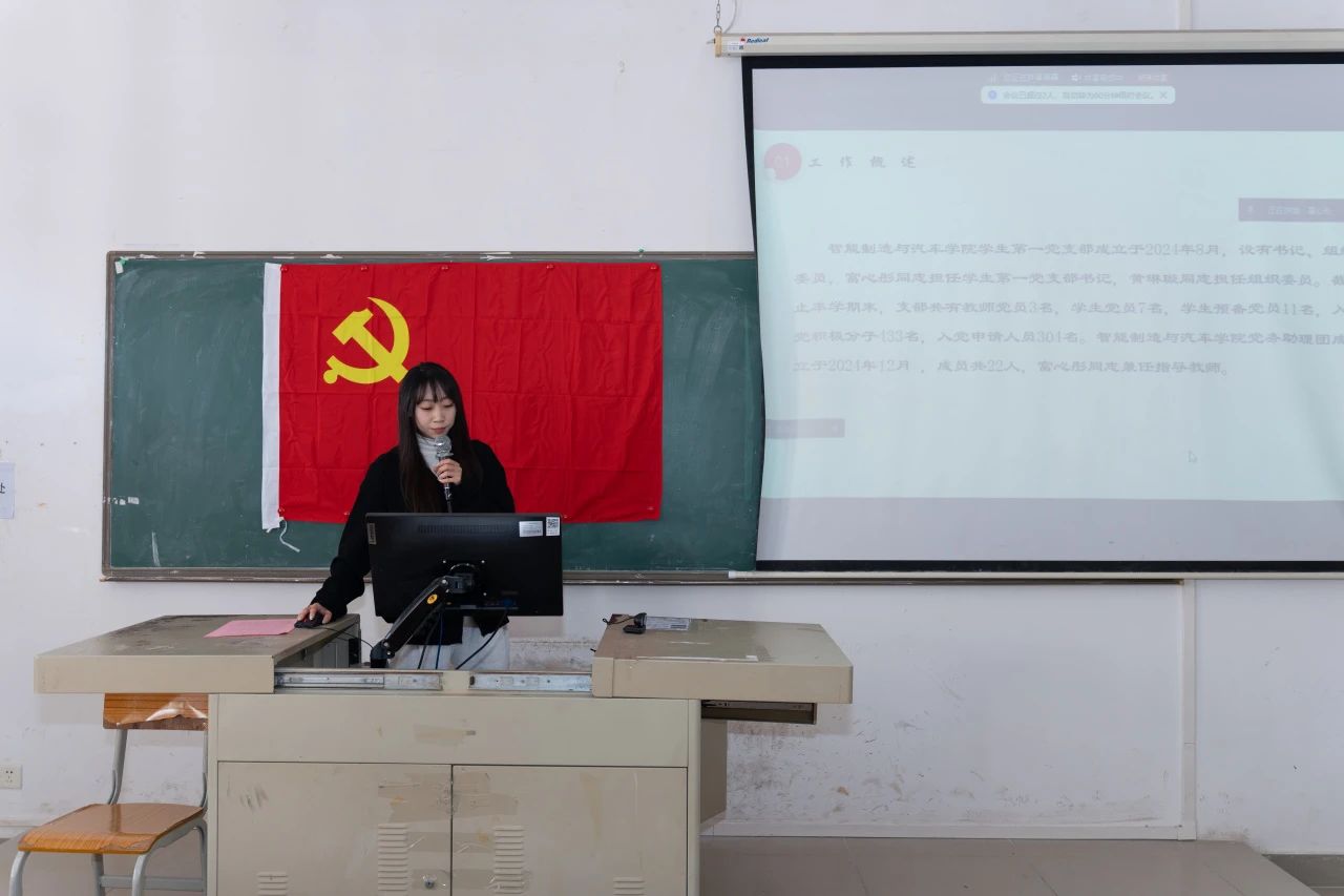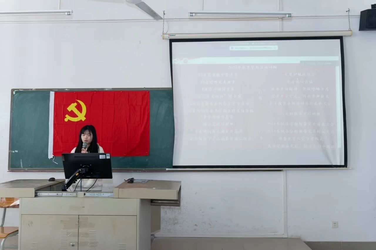 随后,学院党总支组织委员、学生第一党支部书记富心彤同志展示了本学期学生第一党支部所开展的多项党建活动。学生第一党支部利用多种活动方式去强化党员的政治引领,加强党员队伍建设并推动党建与业务工作深度融合。同时,富心彤同志对本学期支部所存在的问题进行剖析并指定下一步计划,将做到持续强化理论武装,筑牢思想根基,创新党建活动方式,增强组织活力。
