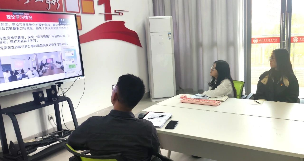 然后,由学院党总支宣传委员、学生第二党支部书记周杨同志进行述职汇报。学生第二党支部被评选为广州华商职业学院第三批党建双创工作“党建样板党支部”,并展示了本学期学生第二党支部的丰硕的党建活动成果,将党建工作落细落实。同时,周杨同志结合本学期所出现的问题,从思想、组织和作风等方面作出改进计划,进一步推进党建工作的发展。