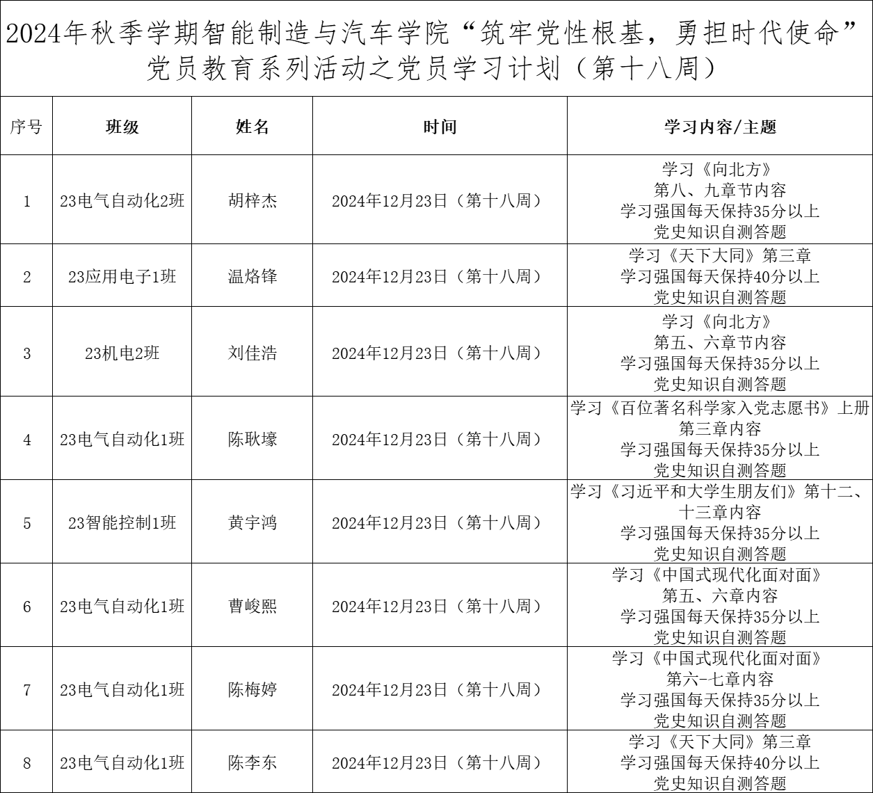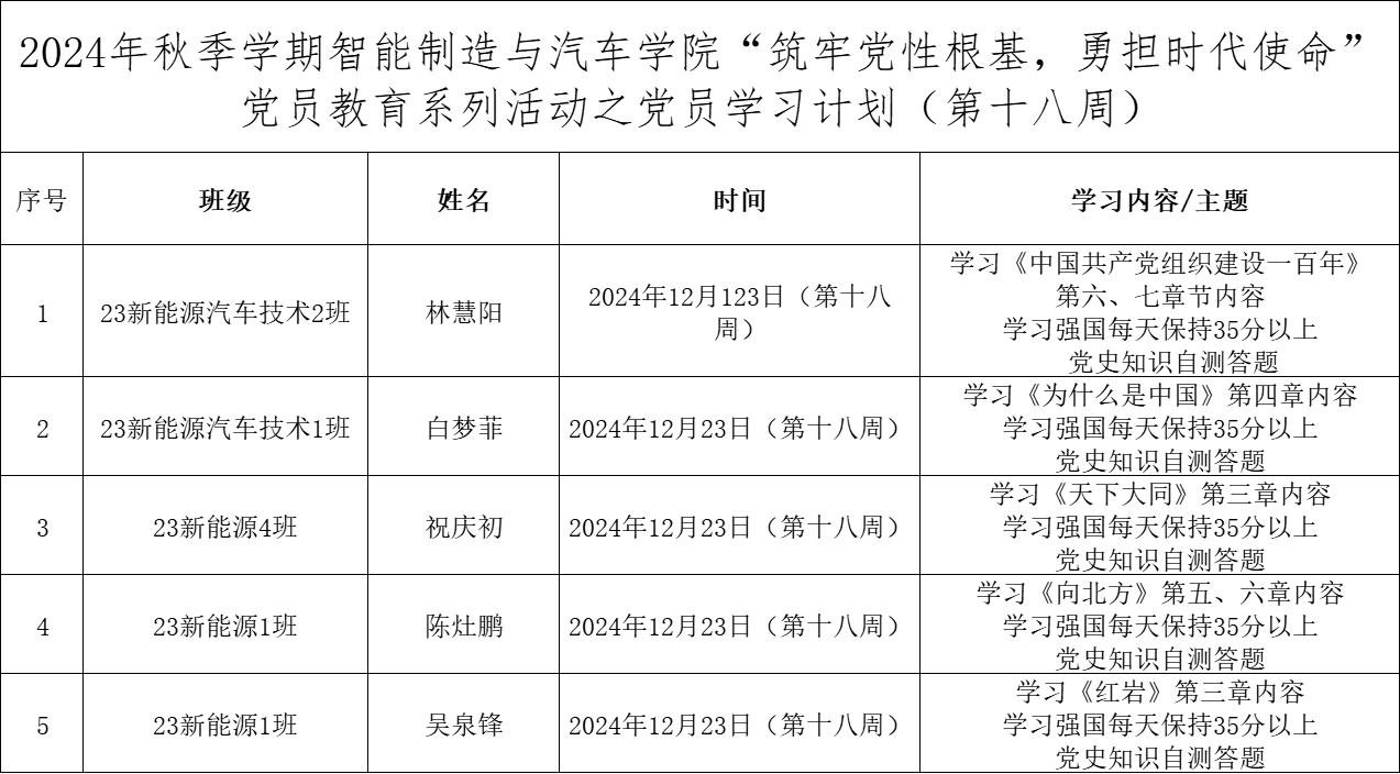 为深化党员的自我教育管理模式,切实提升党员自我教育管理实效,智能制造与汽车学院党总支针对现阶段党员教育管理不足现状,积极探索,组织开展党员自我教育学习活动,锚定学习目标,认真贯彻落实,狠抓推进整改,抓好奖励惩罚。现将第十八周党员学习计划及检查结果公布如下。