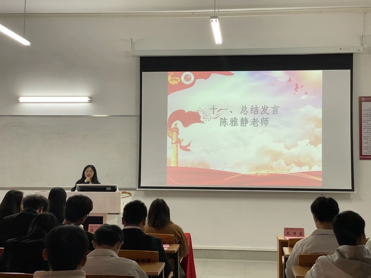 宣誓完毕,陈雅静老师进行会议总结。首先,她对学生组织过去的工作表示肯定,表示学生组织是学院发展不可或缺的力量。同时,她对上一届指导老师以及学生工作人员表示衷心的感谢。此外,她希望新工作人员以此为榜样,不断提升自身能力,积极发挥模范带头作用,共同推动学院学生工作取得新的进步。