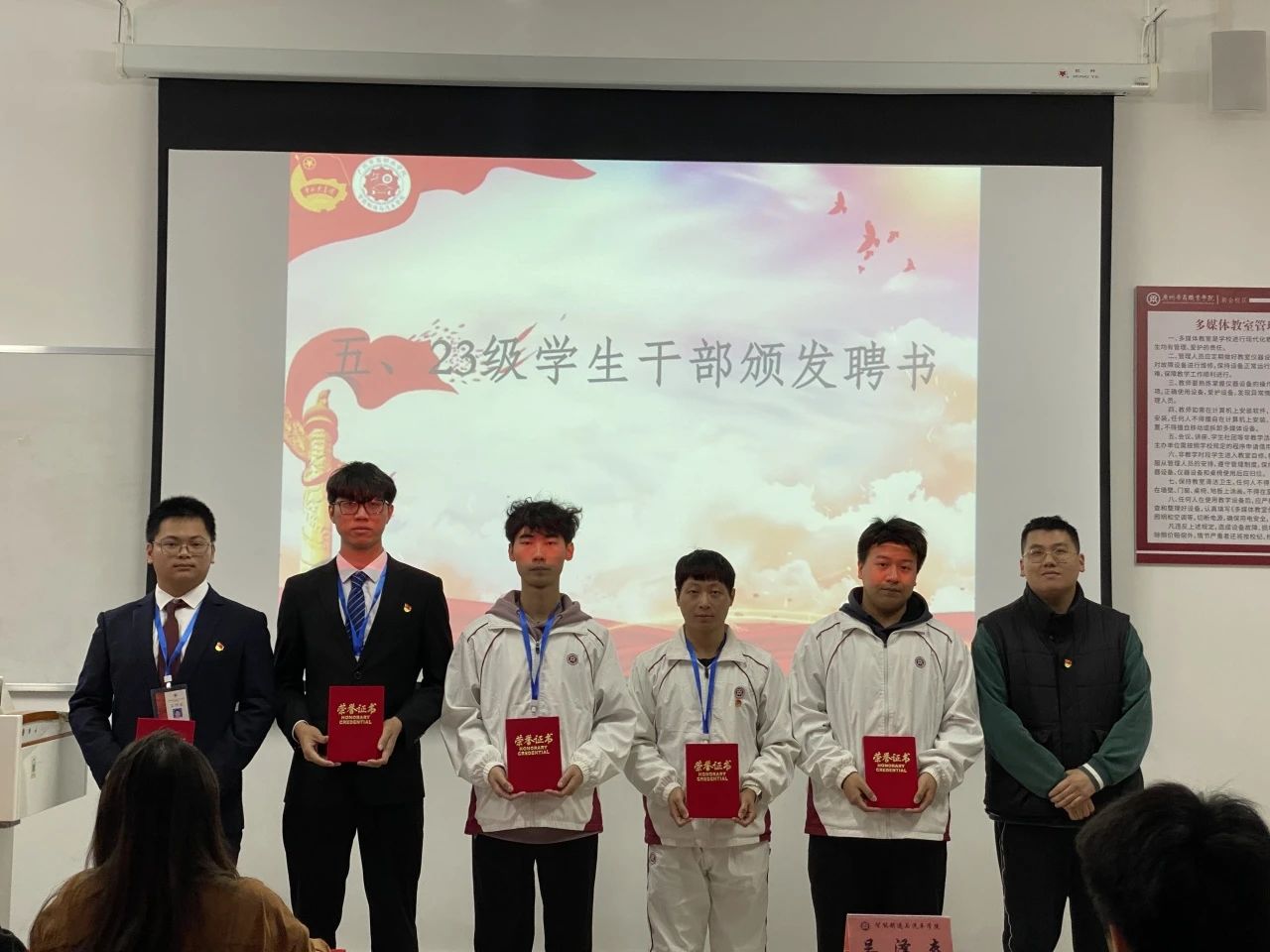 接下来,老师们为上一届学生工作人员颁发聘书。吴泽森老师颁发党务团学生工作人员的聘书,陈雅静老师颁发团委办公室学生工作人员的聘书,温瑞瑜老师颁发学生会学生工作人员的聘书,王子君老师颁发青协志愿者协会学生工作人员的聘书。