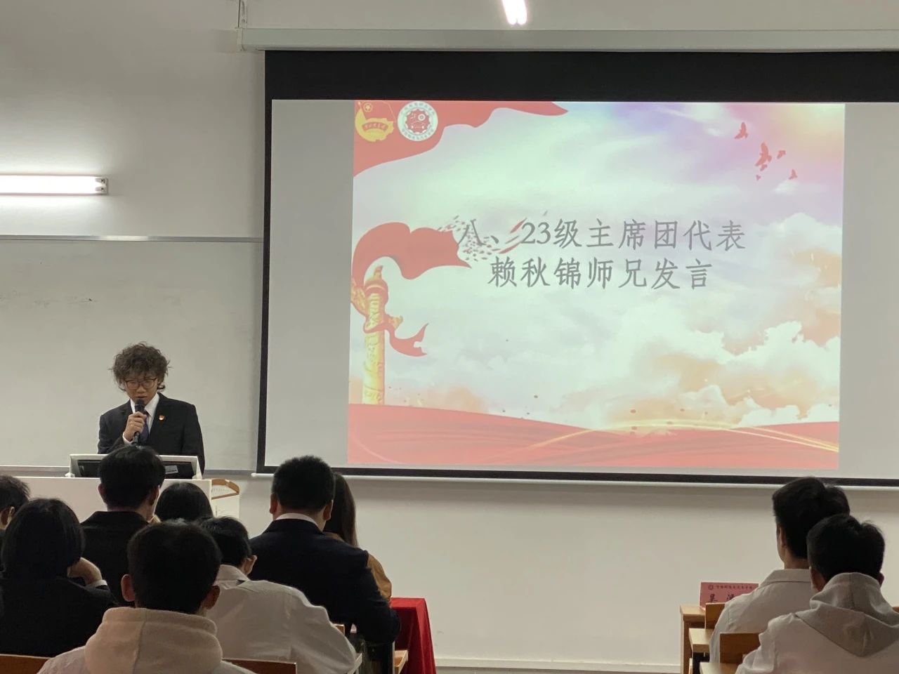 聘书颁发结束,党务团代表凌华杰和主席团代表赖秋锦师兄陆续上台发言,阐述了对未来工作的规划和展望。他们表示将以身作则,带领学院学生组织积极进取,努力为同学们提供更优质的服务,为学院的发展贡献自己的力量。