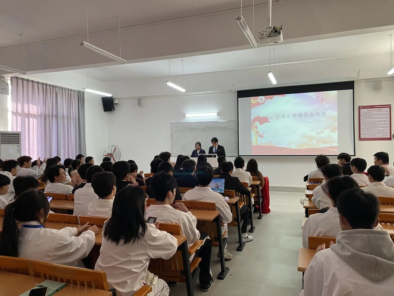 随着慷慨激昂的旋律的结束,主持人陈晟睿、吕哓彤介绍莅临本次大会的领导与嘉宾。