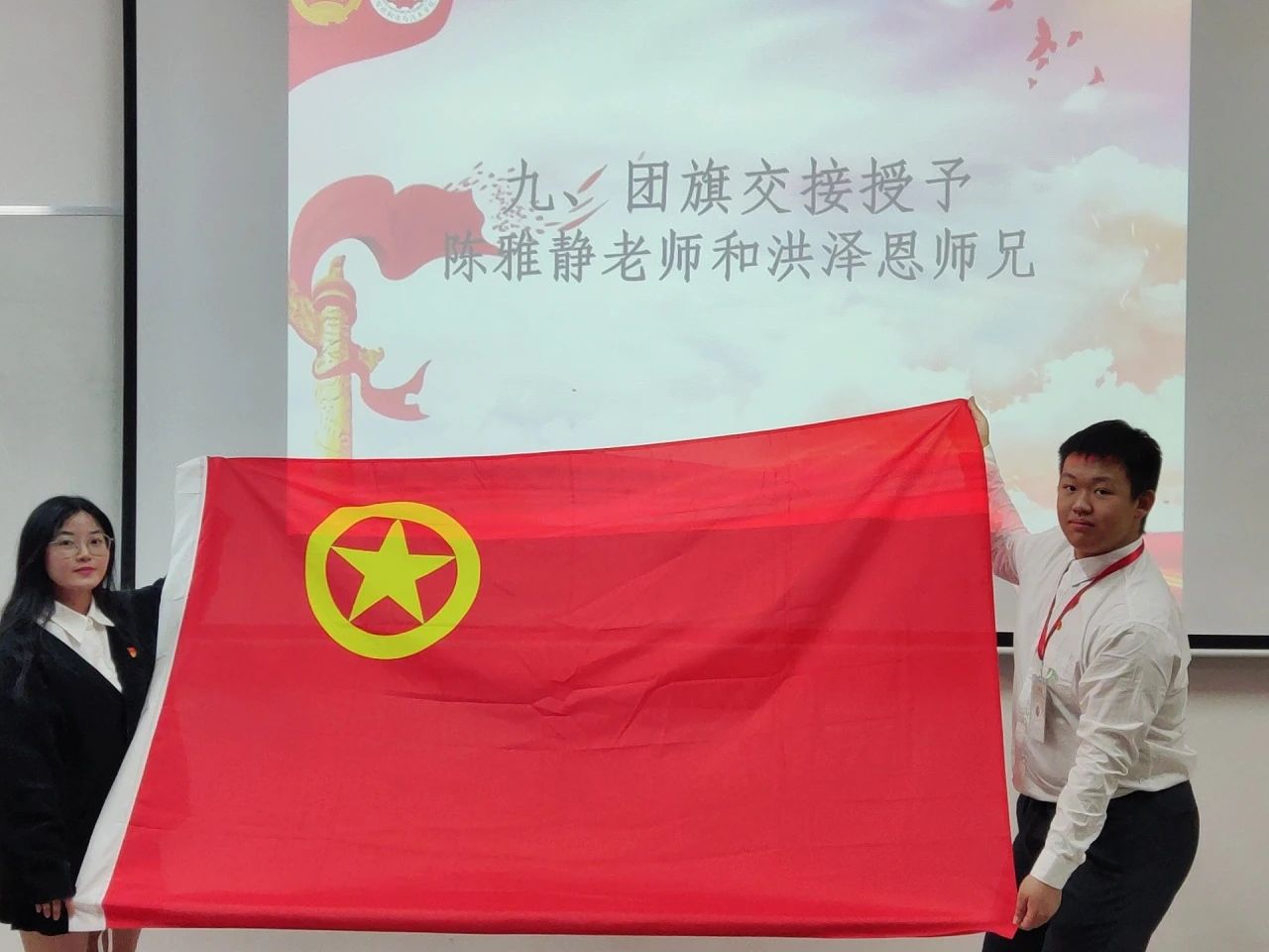 团旗的交接仪式象征着学生组织的精神传承,由陈雅静老师和洪泽恩师兄上台进行团旗交接仪式。