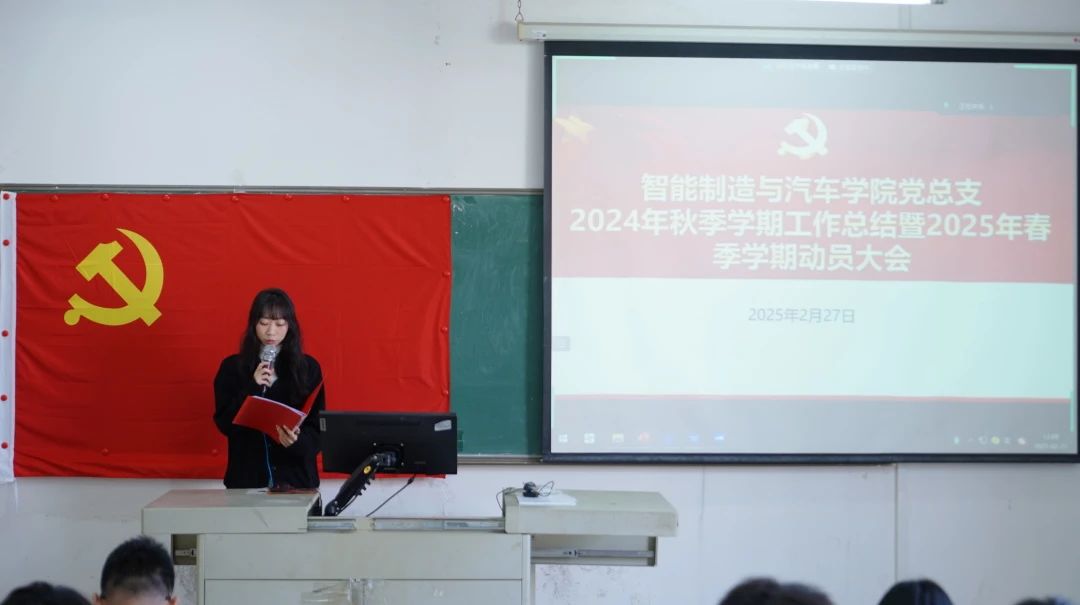 岁序更替,华章日新。为全面复盘过往工作,科学擘画2025年春季学期的发展蓝图,2025年2月27日,智能制造与汽车学院党总支在博学楼C507隆重召开2024年秋季学期工作总结暨2025年春季学期动员大会,会议由学院党总支组织委员、学生第一党支部书记富心彤同志主持。