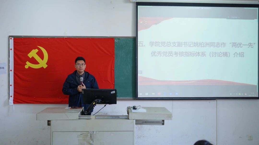学院党总支副书记姚柏洲同志对“两优一先”优秀党员考核指标体系(讨论稿)进行介绍。详细解读各项考核指标,鼓励党员们对照标准,积极发挥先锋模范作用,明确未来努力方向,在工作与学习中争先创优,为学院党建工作添砖加瓦。