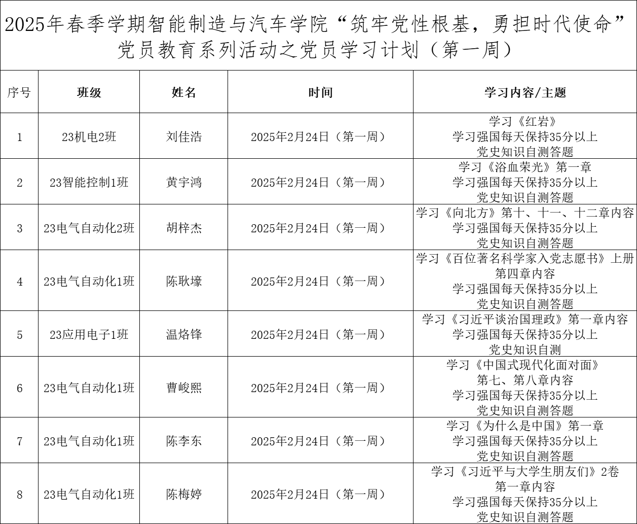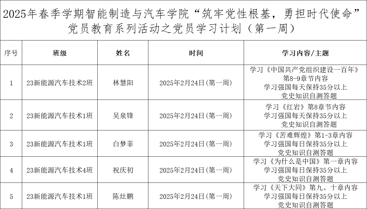 为深化党员的自我教育管理模式,切实提升党员自我教育管理实效,智能制造与汽车学院党总支针对现阶段党员教育管理不足现状,积极探索,组织开展党员自我教育学习活动,锚定学习目标,认真贯彻落实,狠抓推进整改,抓好奖励惩罚。现将第一周党员学习计划及检查结果公布如下:
