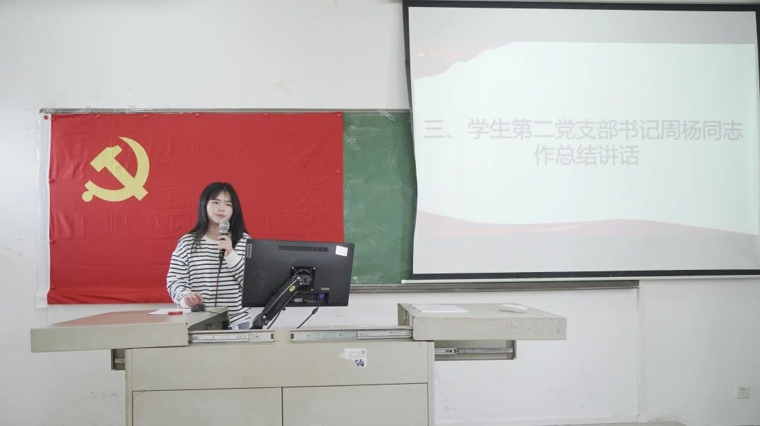 随后,学生第二党支部书记周杨同志作总结讲话,她希望学生党员能不断提升自我,向先辈们学习进步,学习他们的坚韧不拔性格,无私奉献的精神,以党员的标准严格要求自己,纠正自身的不足,不断提高政治理论水平,以更坚定的信念和更扎实的知识储备投入到为人民服务之中,积极发挥先锋模范作用。