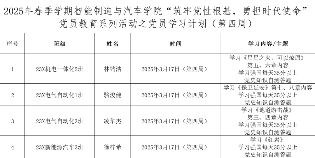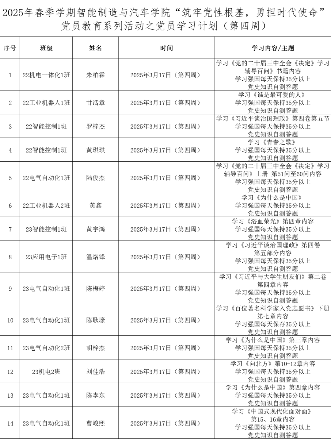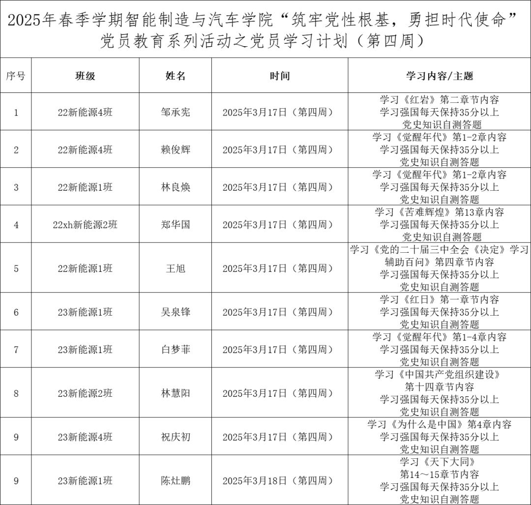 为深化党员的自我教育管理模式,切实提升党员自我教育管理实效,智能制造与汽车学院党总支针对现阶段党员教育管理不足现状,积极探索,组织开展党员自我教育学习活动,锚定学习目标,认真贯彻落实,狠抓推进整改,抓好奖励惩罚。现将第四周党员学习计划及检查结果公布如下: