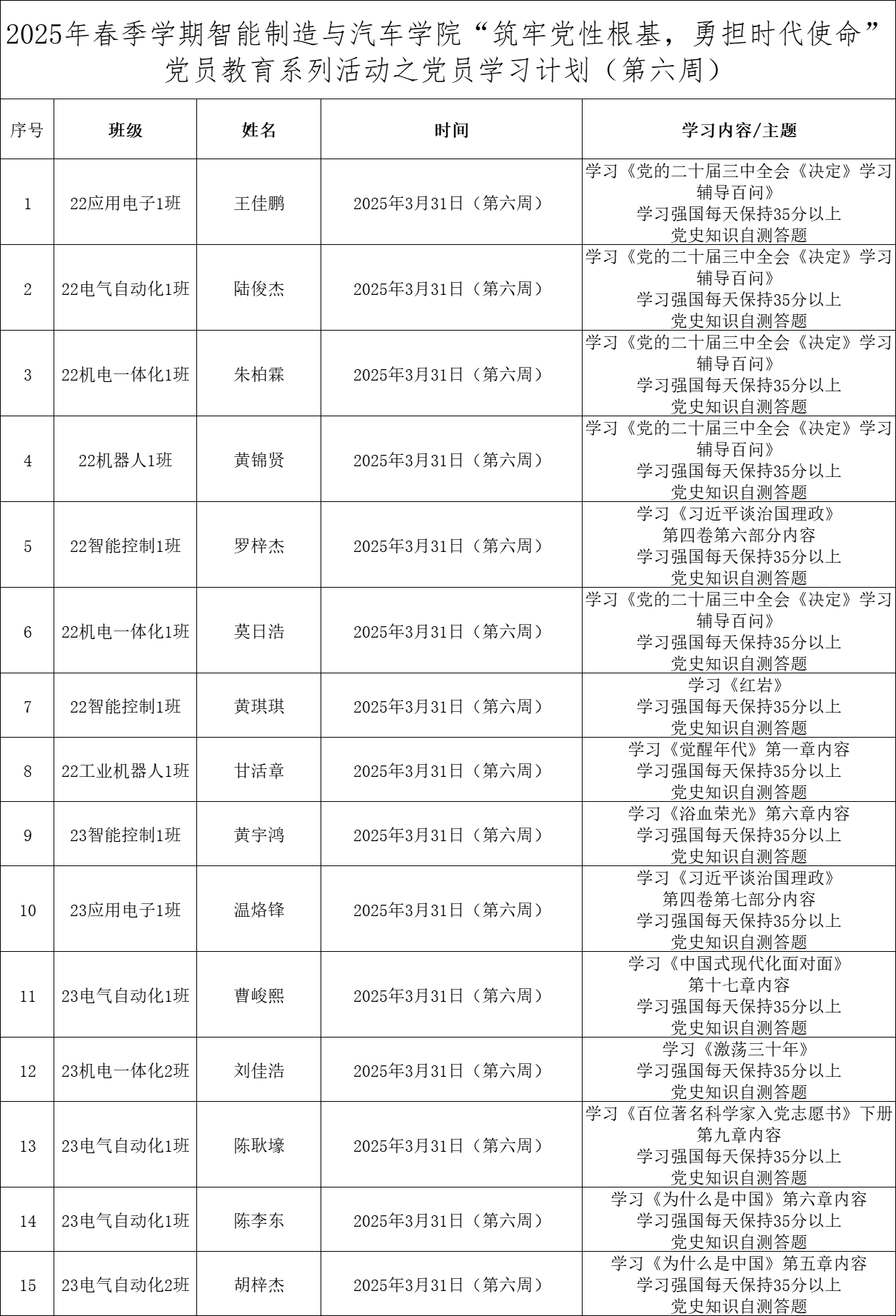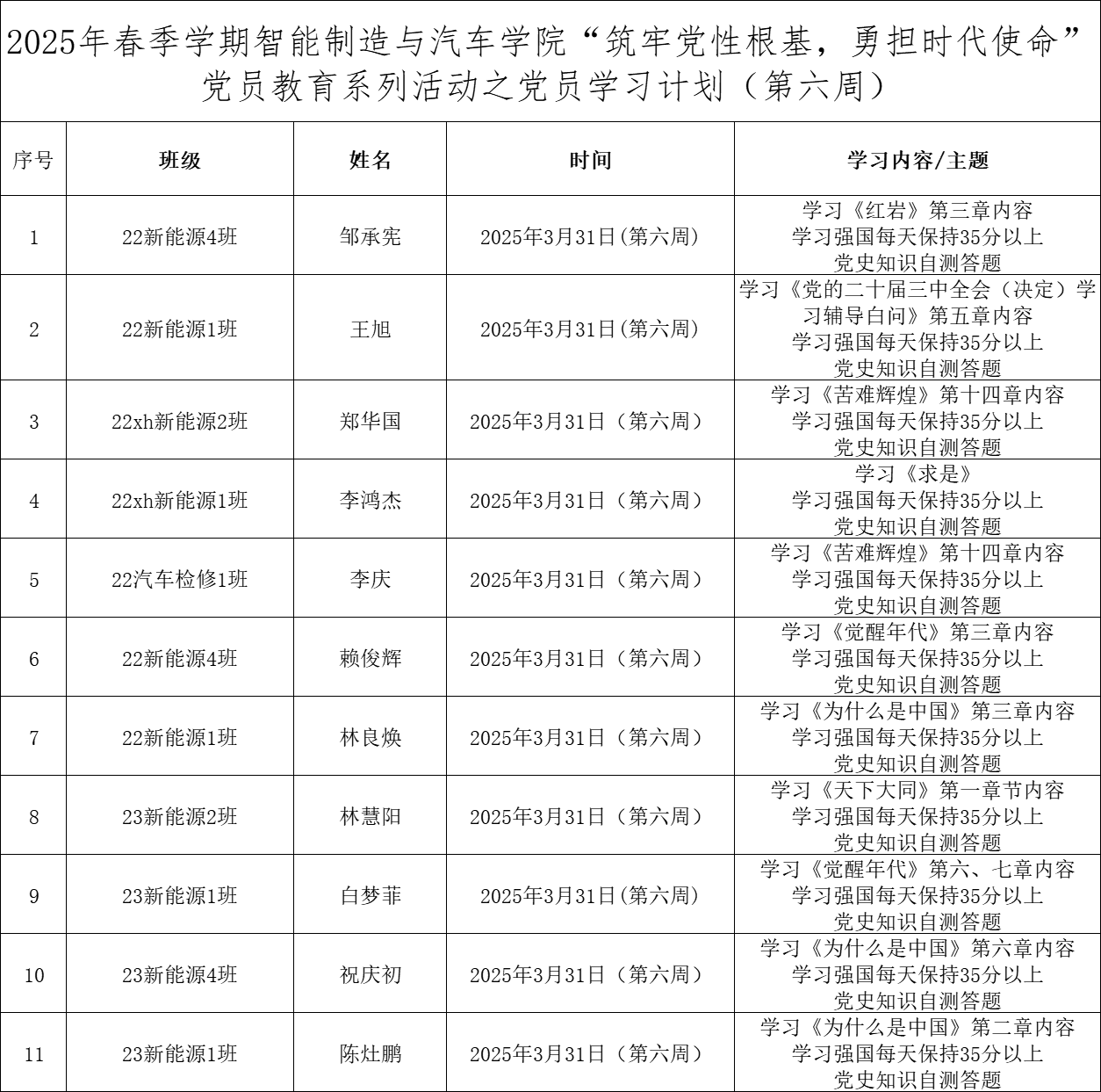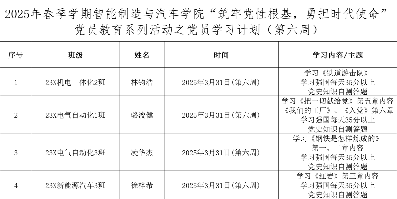 为深化党员的自我教育管理模式,切实提升党员自我教育管理实效,智能制造与汽车学院党总支针对现阶段党员教育管理不足现状,积极探索,组织开展党员自我教育学习活动,锚定学习目标,认真贯彻落实,狠抓推进整改,抓好奖励惩罚。现将第六周党员学习计划及检查结果公布如下: