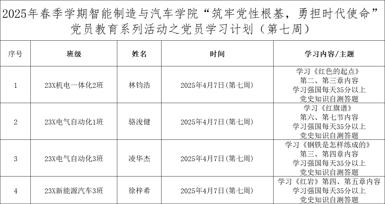 为深化党员的自我教育管理模式,切实提升党员自我教育管理实效,智能制造与汽车学院党总支针对现阶段党员教育管理不足现状,积极探索,组织开展党员自我教育学习活动,锚定学习目标,认真贯彻落实,狠抓推进整改,抓好奖励惩罚。现将第七周党员学习计划及检查结果公布如下: