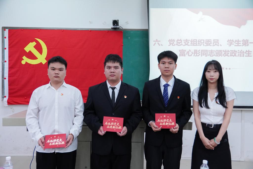 大会第六项议程,学生第一党支部书记富心彤同志为王佳鹏等3名同志颁发政治生日卡。这小小的卡片凝聚着党组织对党员的殷切期许,它提醒着党员同志要时刻牢记入党初心,时刻以更高标准践行使命担当。
