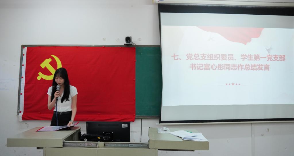 大会第七项议程,学生第一党支部书记富心彤同志作总结发言。富书记首先向王佳鹏等3名同志表示衷心的祝贺,她指出,转正不仅是身份的转变,更是责任的进阶,这不仅是组织的认可,更是一份沉甸甸的责任,党员需时刻以更高的标准审视自身,牢记身份使命。她寄语各位同志,以转正为新起点,把个人成长融入党和国家发展大局,以行动践行初心、以担当诠释信仰,在奋斗中续写党员先锋的使命新篇。
