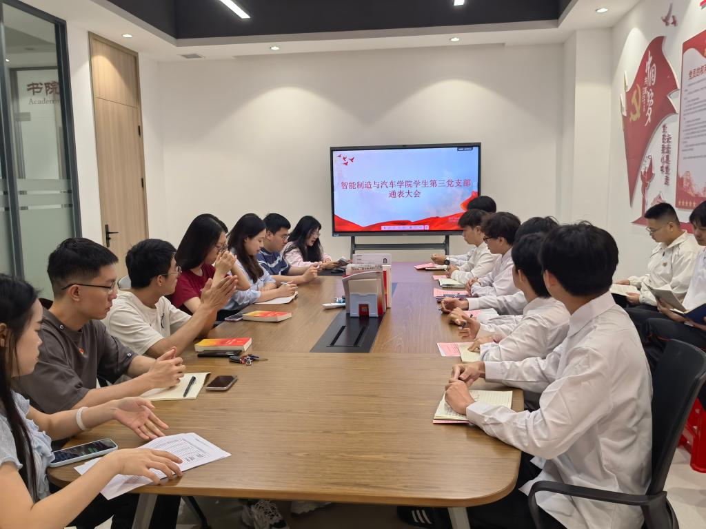 为增强党组织的凝聚力和生命力,为党组织输送新鲜血液,着力锻造政治过硬、本领高强、作风优良的先锋队伍,智能制造与汽车学院学生第三党支部于2025年6月4日在广汉书院知行轩召开2025年春季学期发展对象转预备党员通表大会。支部现有党员12名,其中应到正式党员8人、预备党员4人,实到正式党员7人、预备党员4人,有表决权的实到会正式党员人数超过应到会正式党员人数的2/3,符合规定要求,本次支部大会有效。会议由智能制造与汽车学院学生第三党支部书记陈雅静主持。
