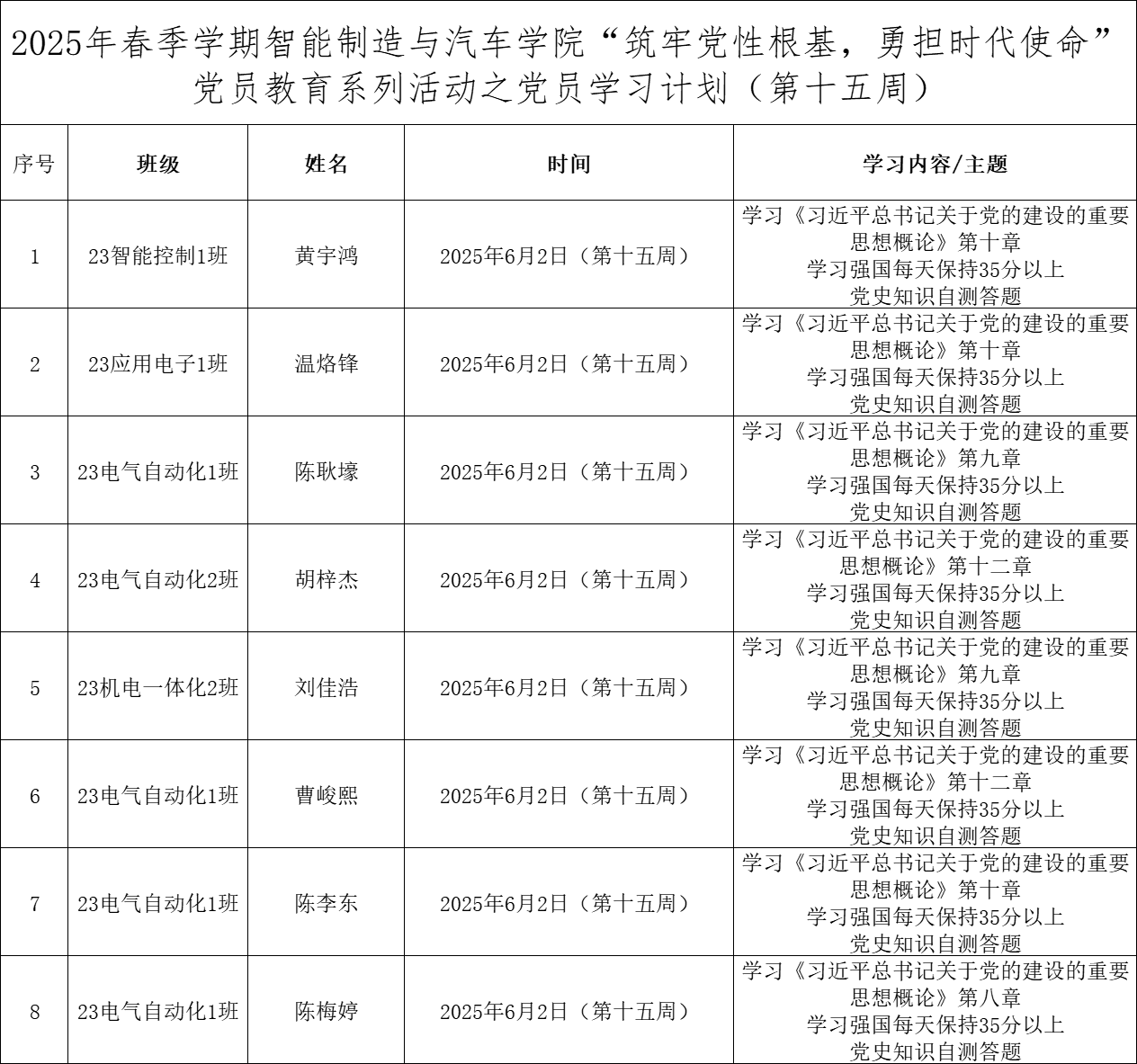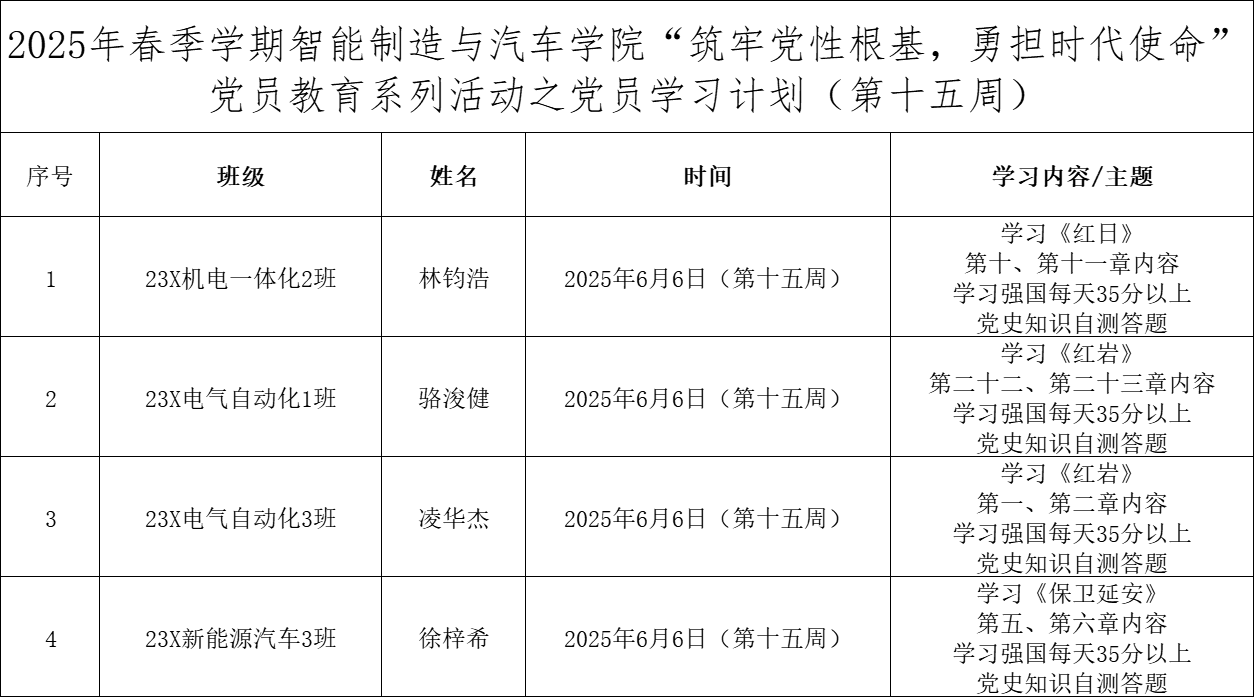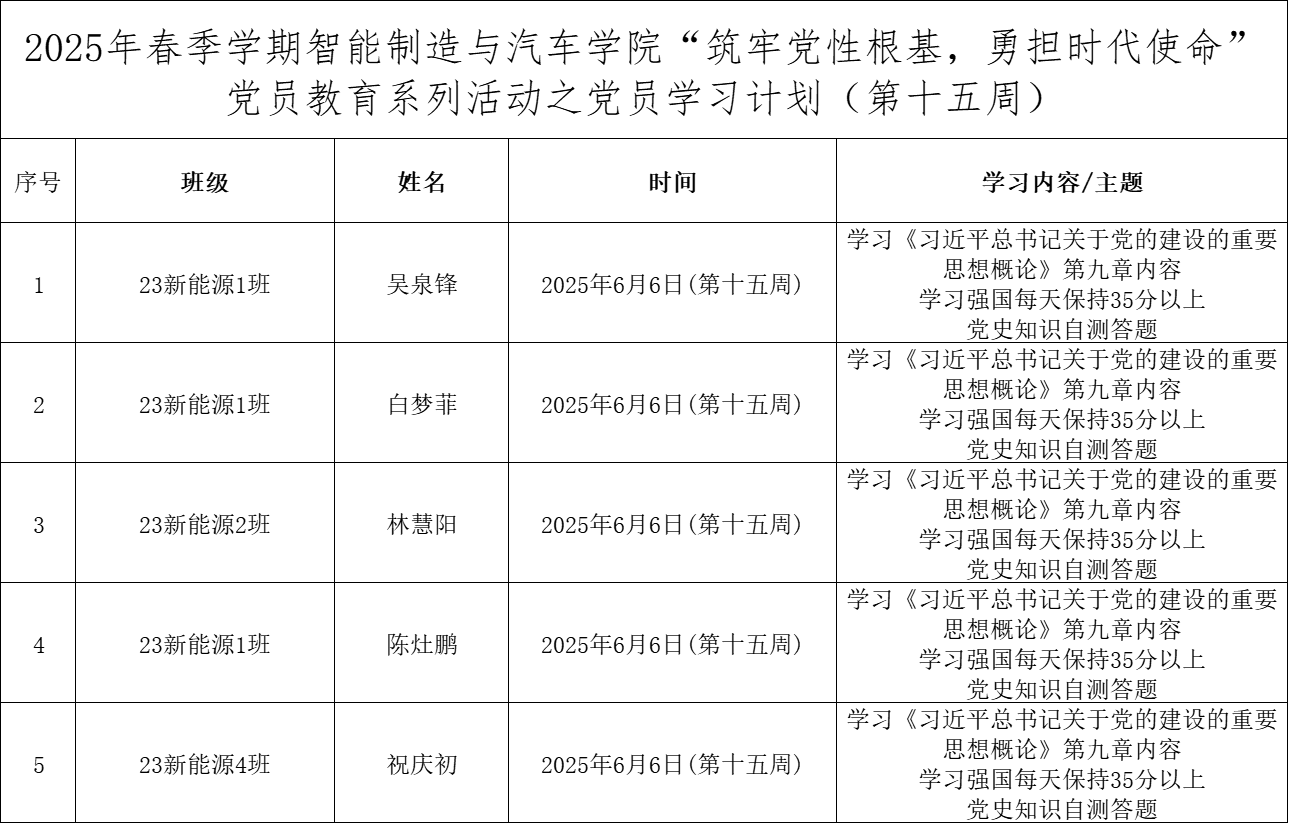 为深化党员的自我教育管理模式,切实提升党员自我教育管理实效,智能制造与汽车学院党总支针对现阶段党员教育管理不足现状,积极探索,组织开展党员自我教育学习活动,锚定学习目标,认真贯彻落实,狠抓推进整改,抓好奖励惩罚。现将第十五周党员学习计划及检查结果公布如下: