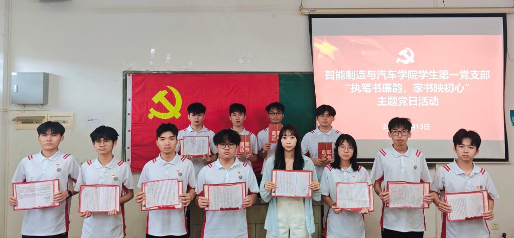 为进一步强化党员廉洁意识,推动廉洁教育走深走实,2025年6月12日,智能制造与汽车学院第一党支部在博学楼C506课室开展“执笔书廉韵,家书映初心”主题党日活动,智能制造与汽车学院党总支组织委员、学生第一党支部书记富心彤同志以及全体学生党员参加此次活动。