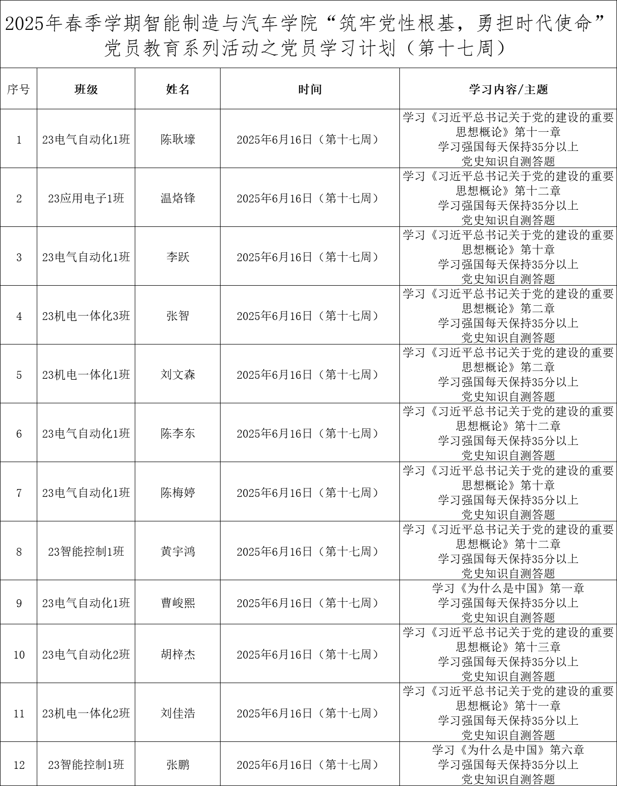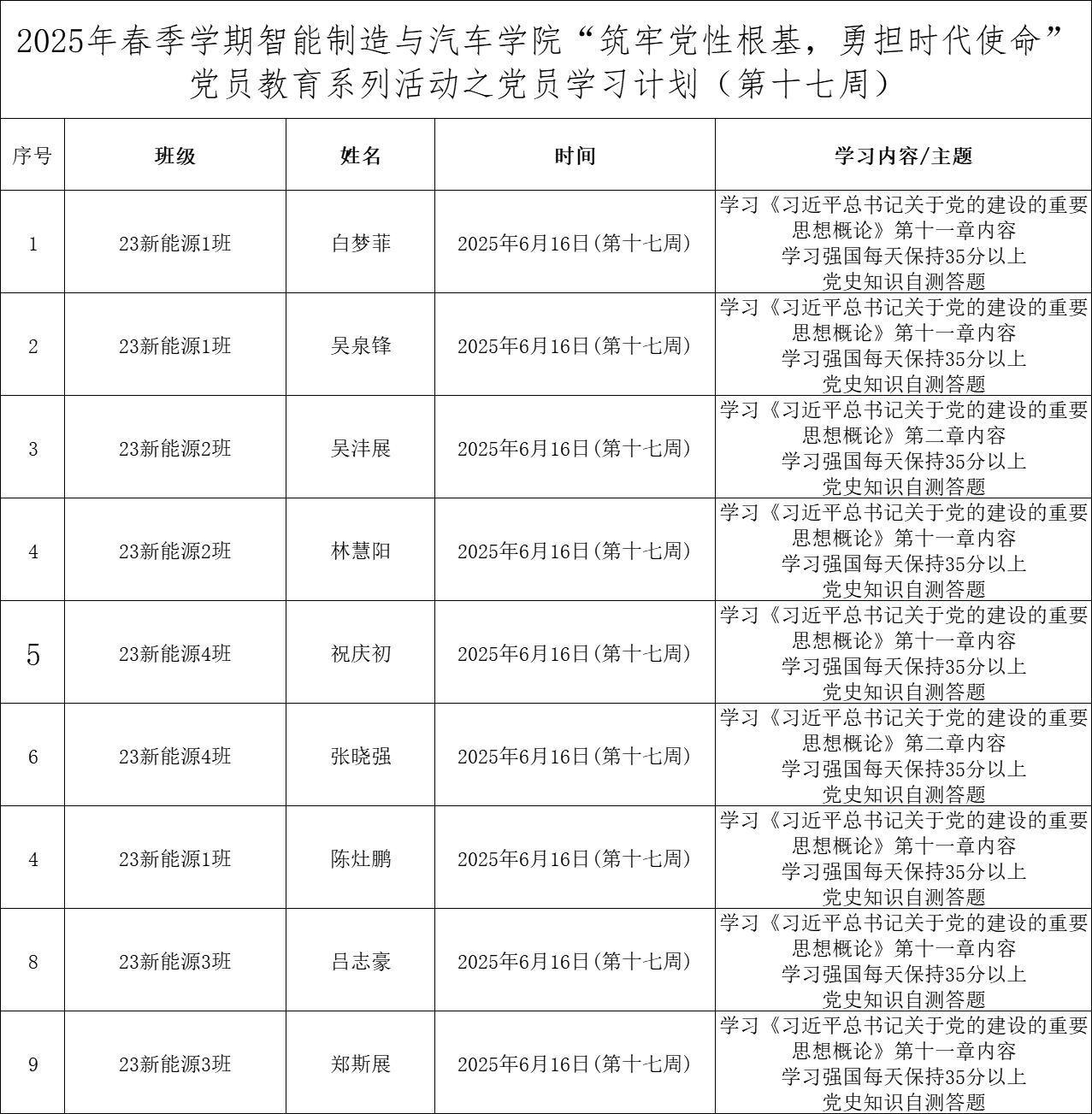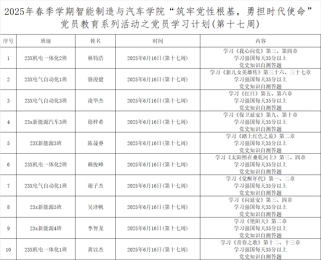 为深化党员的自我教育管理模式,切实提升党员自我教育管理实效,智能制造与汽车学院党总支针对现阶段党员教育管理不足现状,积极探索,组织开展党员自我教育学习活动,锚定学习目标,认真贯彻落实,狠抓推进整改,抓好奖励惩罚。现将第十七周党员学习计划及检查结果公布如下: