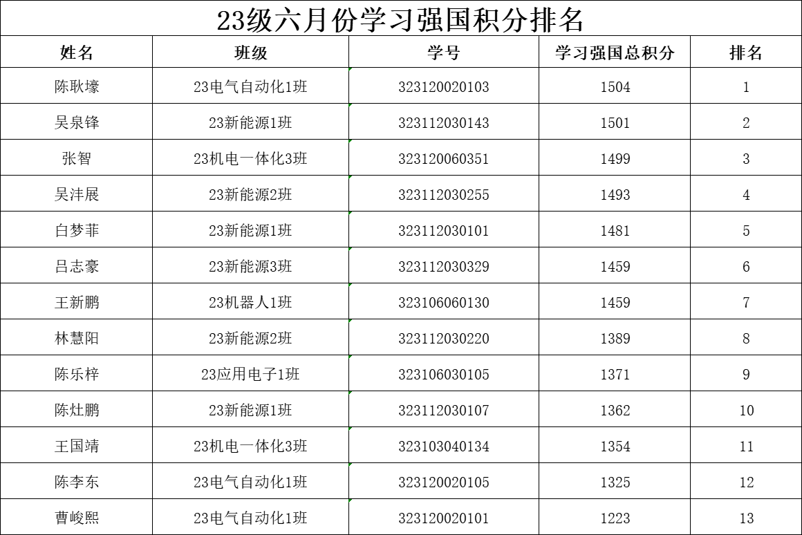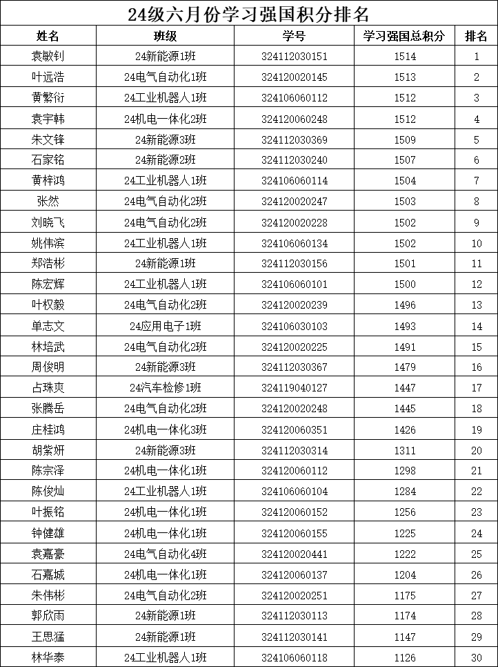 为进一步加大“学习强国”学习平台的宣传推广力度,充分发挥平台的引领作用,深入学习贯彻党的二十届三中全会精神,营造真学、深学、细学的学习氛围,智能制造与汽车学院以“学习强国”积分情况为依据,每月持续推出学习强国积分排行榜,对学习积分优秀的同学进行亮晒,推动“学习强国”学习教育在我院走深、走实、走心,掀起“学思践悟强担当,勇毅前行建新功”的热潮。