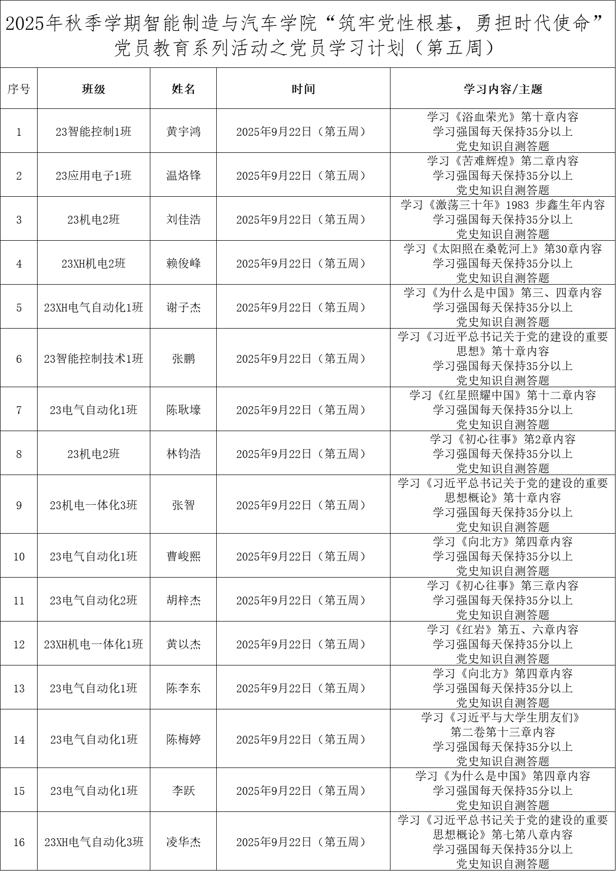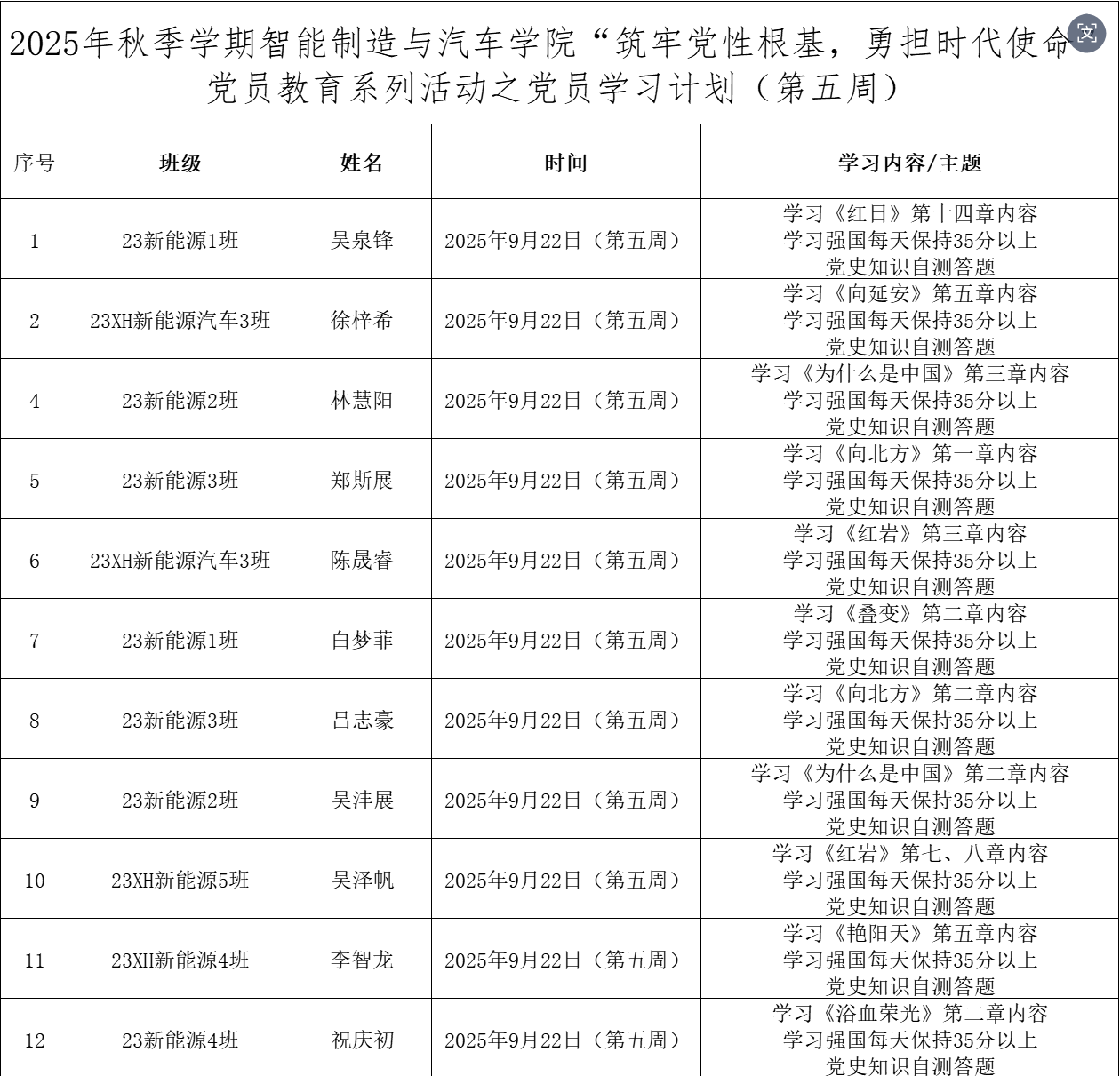 为深化党员的自我教育管理模式,切实提升党员自我教育管理实效,智能制造与汽车学院党总支针对现阶段党员教育管理不足现状,积极探索,组织开展党员自我教育学习活动,锚定学习目标,认真贯彻落实,狠抓推进整改,抓好奖励惩罚。现将第五周党员学习计划及检查结果公布如下: