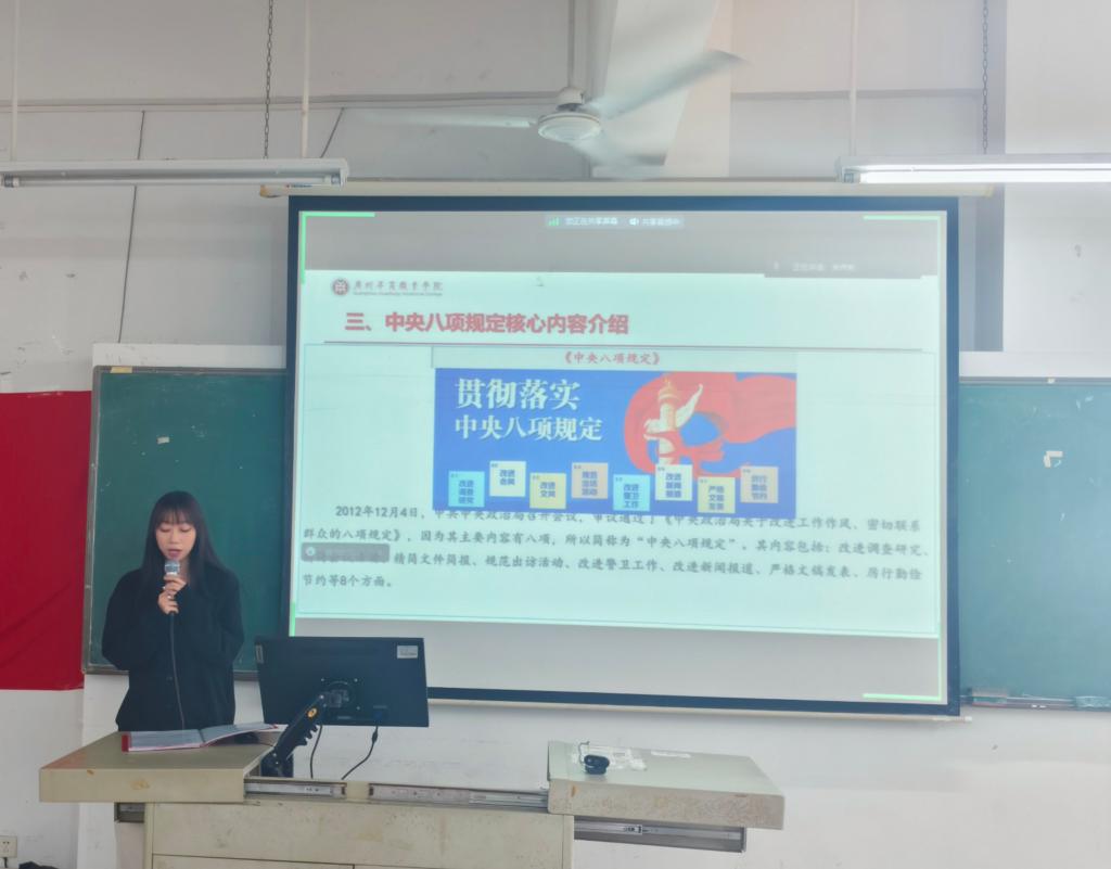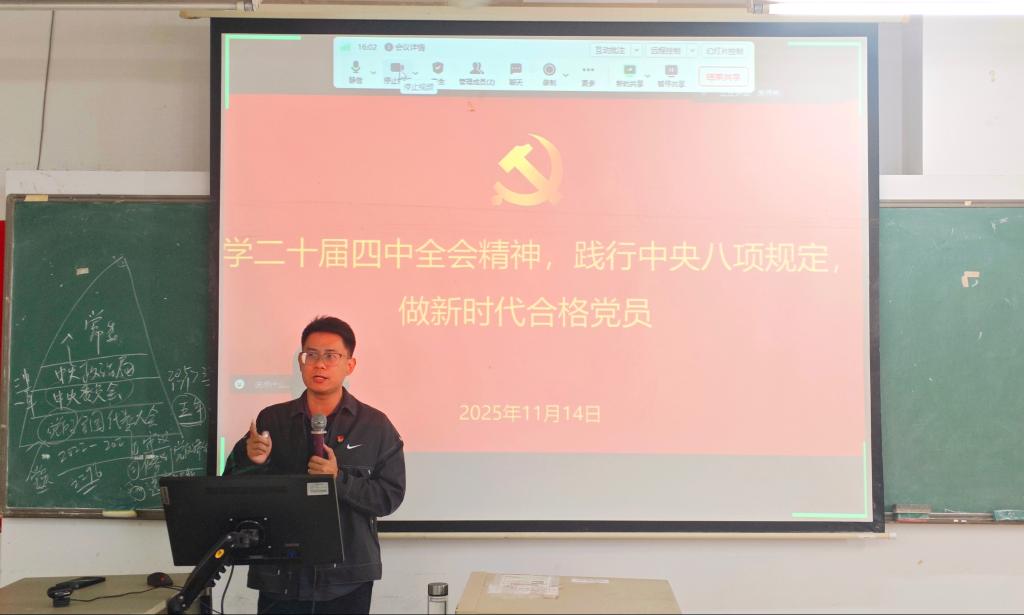 首先,学院党总支组织委员、学生第一党支部书记富心彤同志以作“学二十届四中全会精神,践行中央八项规定”为主题开展授课。她强调,中央八项规定精神是新时代党的作风建设的重要遵循,学生党员更应主动对标对表,在校园生活中明方向、守底线。要以此次学习为契机,把优良作风融入日常言行,在学业钻研中保持务实态度,在集体生活中涵养勤俭品格,在服务同学中秉持真诚初心,以学生党员的担当传递清风正气。